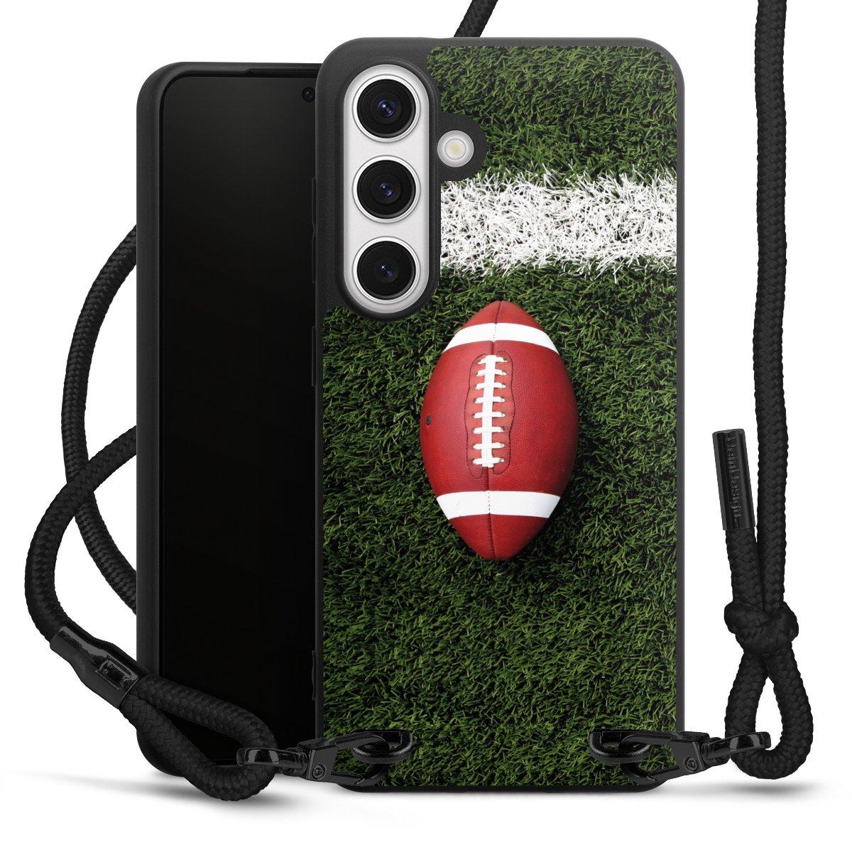 The matt black silicone case is made of flexible TPU (thermoplastic polyurethane) and offers robust protection. The durable, unbreakable material makes the cover flexible and dimensionally stable at the same time. The matte surface makes your design stand out more and is less susceptible to fingerprints and dirt. The stylish trend accessory fits comfortably in the hand and is perfectly complemented by the fabric (polyester) mobile phone strap. The braided fabric strap is approx. 1.70 metres long with a diameter of approx. 0.5 cm. Due to the special knotting technique, the length of the strap can be adjusted by simply pulling it, so that you can adapt it individually to your wishes. The practical case to wear around your neck is available with the fabric strap in black. As a little icing on the cake, we have provided the strap with a chic metal fastener in matt black. The strap is securely fastened to the case with loops made of high-quality genuine leather and press studs. The ends of the fabric strap are covered with metallic end caps and thus protected from fraying.