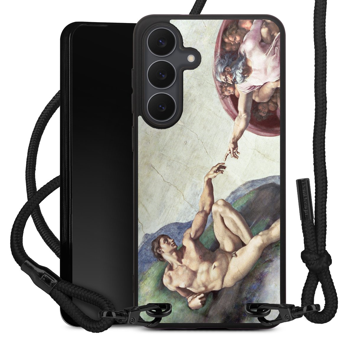 The matt black silicone case is made of flexible TPU (thermoplastic polyurethane) and offers robust protection. The durable, unbreakable material makes the cover flexible and dimensionally stable at the same time. The matte surface makes your design stand out more and is less susceptible to fingerprints and dirt. The stylish trend accessory fits comfortably in the hand and is perfectly complemented by the fabric (polyester) mobile phone strap. The braided fabric strap is approx. 1.70 metres long with a diameter of approx. 0.5 cm. Due to the special knotting technique, the length of the strap can be adjusted by simply pulling it, so that you can adapt it individually to your wishes. The practical case to wear around your neck is available with the fabric strap in black. As a little icing on the cake, we have provided the strap with a chic metal fastener in matt black. The strap is securely fastened to the case with loops made of high-quality genuine leather and press studs. The ends of the fabric strap are covered with metallic end caps and thus protected from fraying.