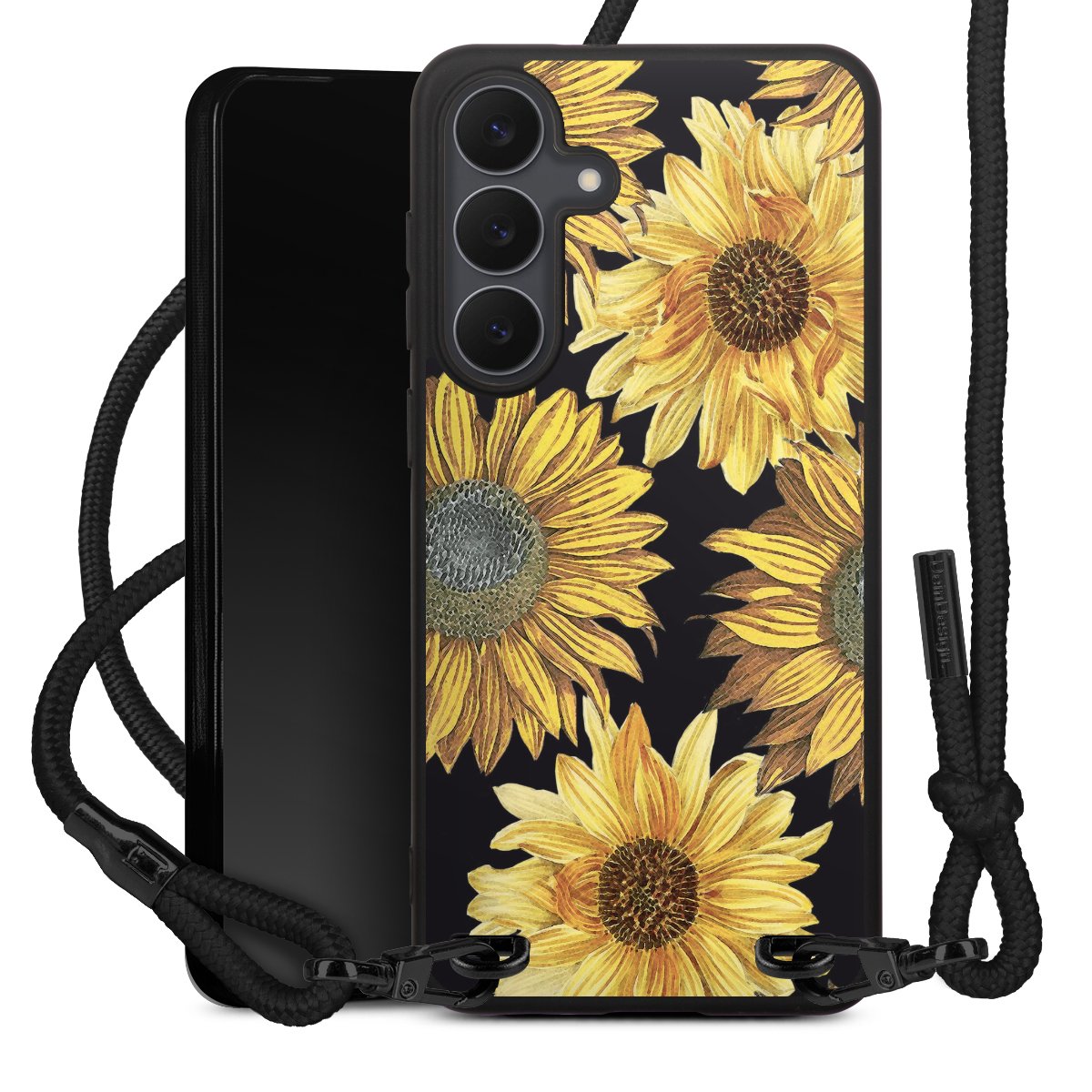 The matt black silicone case is made of flexible TPU (thermoplastic polyurethane) and offers robust protection. The durable, unbreakable material makes the cover flexible and dimensionally stable at the same time. The matte surface makes your design stand out more and is less susceptible to fingerprints and dirt. The stylish trend accessory fits comfortably in the hand and is perfectly complemented by the fabric (polyester) mobile phone strap. The braided fabric strap is approx. 1.70 metres long with a diameter of approx. 0.5 cm. Due to the special knotting technique, the length of the strap can be adjusted by simply pulling it, so that you can adapt it individually to your wishes. The practical case to wear around your neck is available with the fabric strap in black. As a little icing on the cake, we have provided the strap with a chic metal fastener in matt black. The strap is securely fastened to the case with loops made of high-quality genuine leather and press studs. The ends of the fabric strap are covered with metallic end caps and thus protected from fraying.
