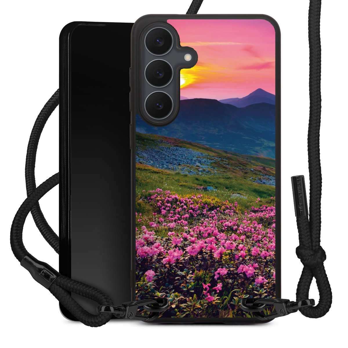 The matt black silicone case is made of flexible TPU (thermoplastic polyurethane) and offers robust protection. The durable, unbreakable material makes the cover flexible and dimensionally stable at the same time. The matte surface makes your design stand out more and is less susceptible to fingerprints and dirt. The stylish trend accessory fits comfortably in the hand and is perfectly complemented by the fabric (polyester) mobile phone strap. The braided fabric strap is approx. 1.70 metres long with a diameter of approx. 0.5 cm. Due to the special knotting technique, the length of the strap can be adjusted by simply pulling it, so that you can adapt it individually to your wishes. The practical case to wear around your neck is available with the fabric strap in black. As a little icing on the cake, we have provided the strap with a chic metal fastener in matt black. The strap is securely fastened to the case with loops made of high-quality genuine leather and press studs. The ends of the fabric strap are covered with metallic end caps and thus protected from fraying.