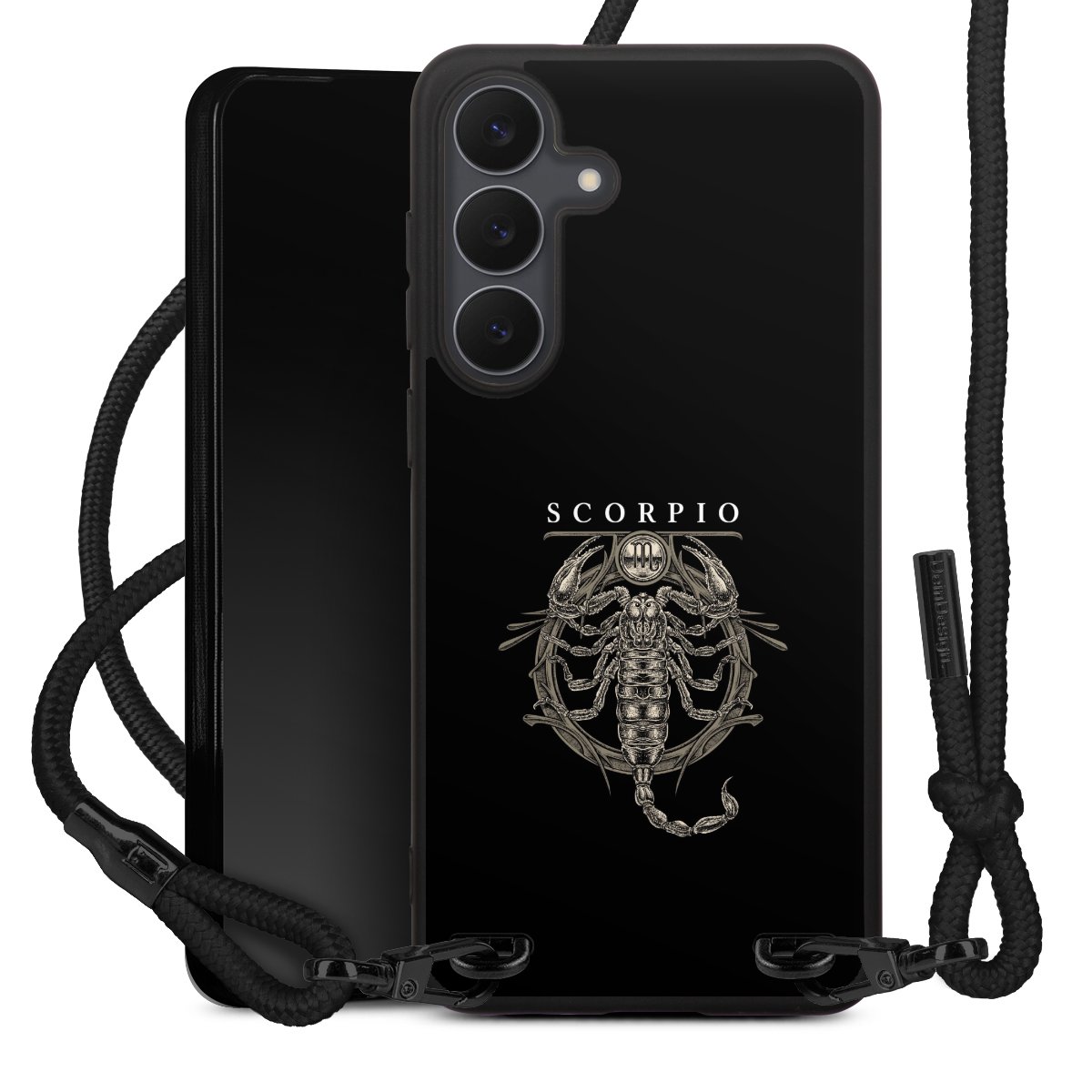 The matt black silicone case is made of flexible TPU (thermoplastic polyurethane) and offers robust protection. The durable, unbreakable material makes the cover flexible and dimensionally stable at the same time. The matte surface makes your design stand out more and is less susceptible to fingerprints and dirt. The stylish trend accessory fits comfortably in the hand and is perfectly complemented by the fabric (polyester) mobile phone strap. The braided fabric strap is approx. 1.70 metres long with a diameter of approx. 0.5 cm. Due to the special knotting technique, the length of the strap can be adjusted by simply pulling it, so that you can adapt it individually to your wishes. The practical case to wear around your neck is available with the fabric strap in black. As a little icing on the cake, we have provided the strap with a chic metal fastener in matt black. The strap is securely fastened to the case with loops made of high-quality genuine leather and press studs. The ends of the fabric strap are covered with metallic end caps and thus protected from fraying.