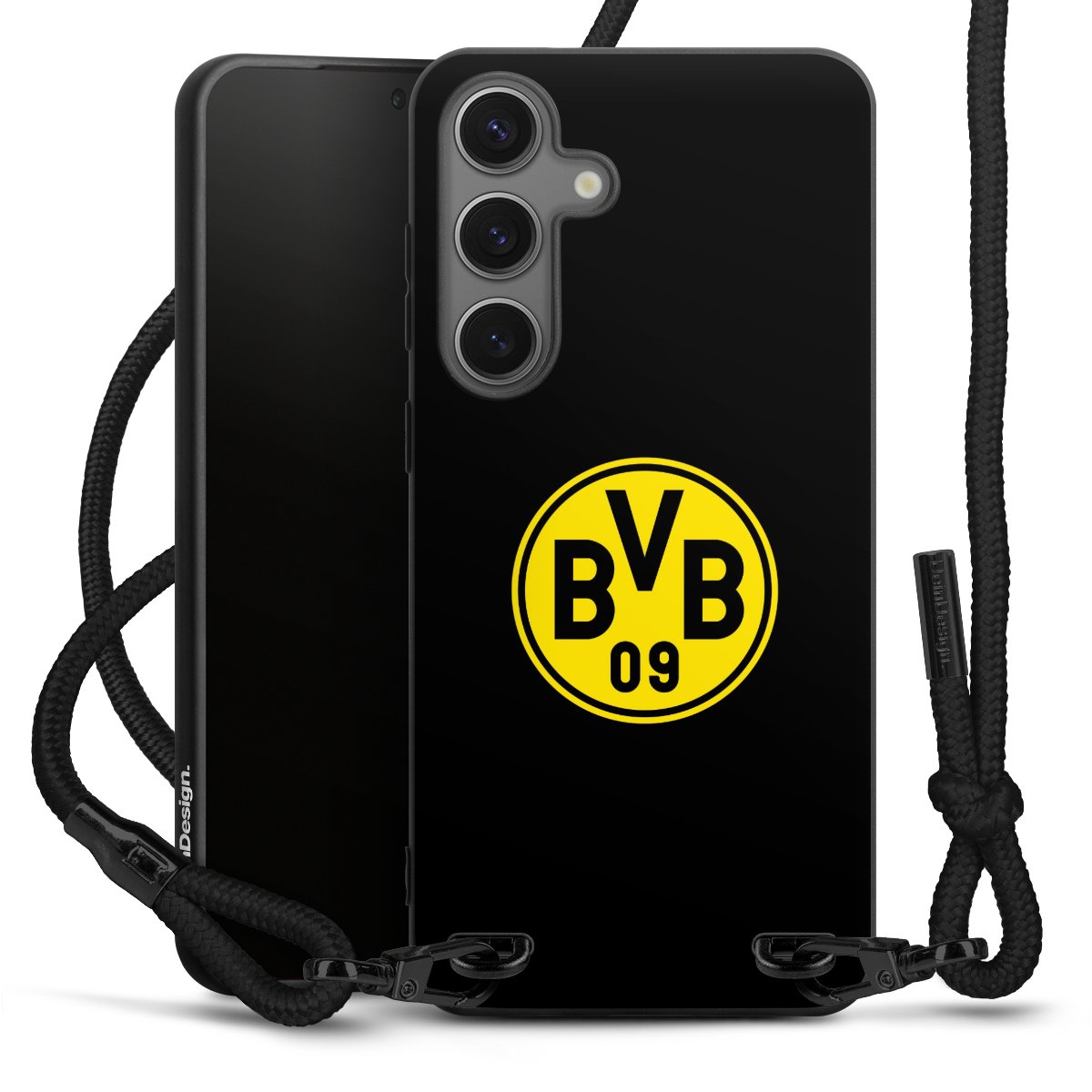 The matt black silicone case is made of flexible TPU (thermoplastic polyurethane) and offers robust protection. The durable, unbreakable material makes the cover flexible and dimensionally stable at the same time. The matte surface makes your design stand out more and is less susceptible to fingerprints and dirt. The stylish trend accessory fits comfortably in the hand and is perfectly complemented by the fabric (polyester) mobile phone strap. The braided fabric strap is approx. 1.70 metres long with a diameter of approx. 0.5 cm. Due to the special knotting technique, the length of the strap can be adjusted by simply pulling it, so that you can adapt it individually to your wishes. The practical case to wear around your neck is available with the fabric strap in black. As a little icing on the cake, we have provided the strap with a chic metal fastener in matt black. The strap is securely fastened to the case with loops made of high-quality genuine leather and press studs. The ends of the fabric strap are covered with metallic end caps and thus protected from fraying.