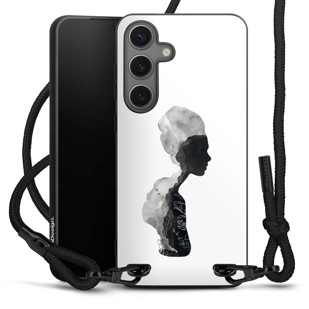 The matt black silicone case is made of flexible TPU (thermoplastic polyurethane) and offers robust protection. The durable, unbreakable material makes the cover flexible and dimensionally stable at the same time. The matte surface makes your design stand out more and is less susceptible to fingerprints and dirt. The stylish trend accessory fits comfortably in the hand and is perfectly complemented by the fabric (polyester) mobile phone strap. The braided fabric strap is approx. 1.70 metres long with a diameter of approx. 0.5 cm. Due to the special knotting technique, the length of the strap can be adjusted by simply pulling it, so that you can adapt it individually to your wishes. The practical case to wear around your neck is available with the fabric strap in black. As a little icing on the cake, we have provided the strap with a chic metal fastener in matt black. The strap is securely fastened to the case with loops made of high-quality genuine leather and press studs. The ends of the fabric strap are covered with metallic end caps and thus protected from fraying.