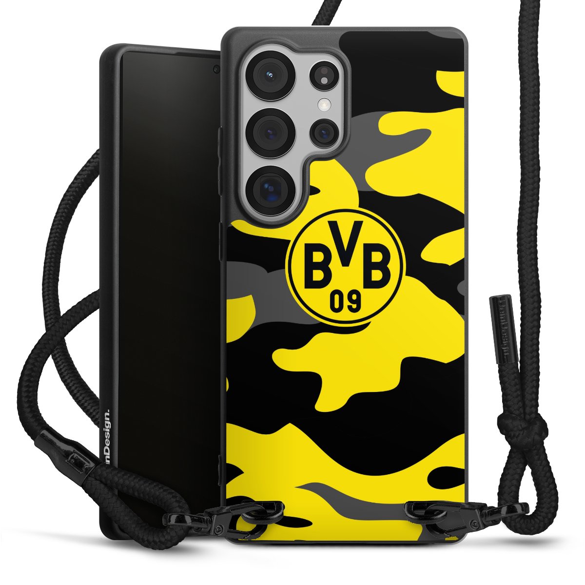 The matt black silicone case is made of flexible TPU (thermoplastic polyurethane) and offers robust protection. The durable, unbreakable material makes the cover flexible and dimensionally stable at the same time. The matte surface makes your design stand out more and is less susceptible to fingerprints and dirt. The stylish trend accessory fits comfortably in the hand and is perfectly complemented by the fabric (polyester) mobile phone strap. The braided fabric strap is approx. 1.70 metres long with a diameter of approx. 0.5 cm. Due to the special knotting technique, the length of the strap can be adjusted by simply pulling it, so that you can adapt it individually to your wishes. The practical case to wear around your neck is available with the fabric strap in black. As a little icing on the cake, we have provided the strap with a chic metal fastener in matt black. The strap is securely fastened to the case with loops made of high-quality genuine leather and press studs. The ends of the fabric strap are covered with metallic end caps and thus protected from fraying.