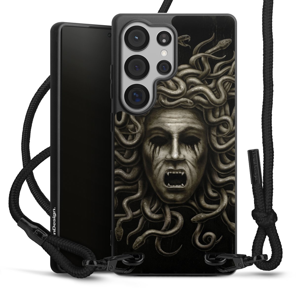 The matt black silicone case is made of flexible TPU (thermoplastic polyurethane) and offers robust protection. The durable, unbreakable material makes the cover flexible and dimensionally stable at the same time. The matte surface makes your design stand out more and is less susceptible to fingerprints and dirt. The stylish trend accessory fits comfortably in the hand and is perfectly complemented by the fabric (polyester) mobile phone strap. The braided fabric strap is approx. 1.70 metres long with a diameter of approx. 0.5 cm. Due to the special knotting technique, the length of the strap can be adjusted by simply pulling it, so that you can adapt it individually to your wishes. The practical case to wear around your neck is available with the fabric strap in black. As a little icing on the cake, we have provided the strap with a chic metal fastener in matt black. The strap is securely fastened to the case with loops made of high-quality genuine leather and press studs. The ends of the fabric strap are covered with metallic end caps and thus protected from fraying.