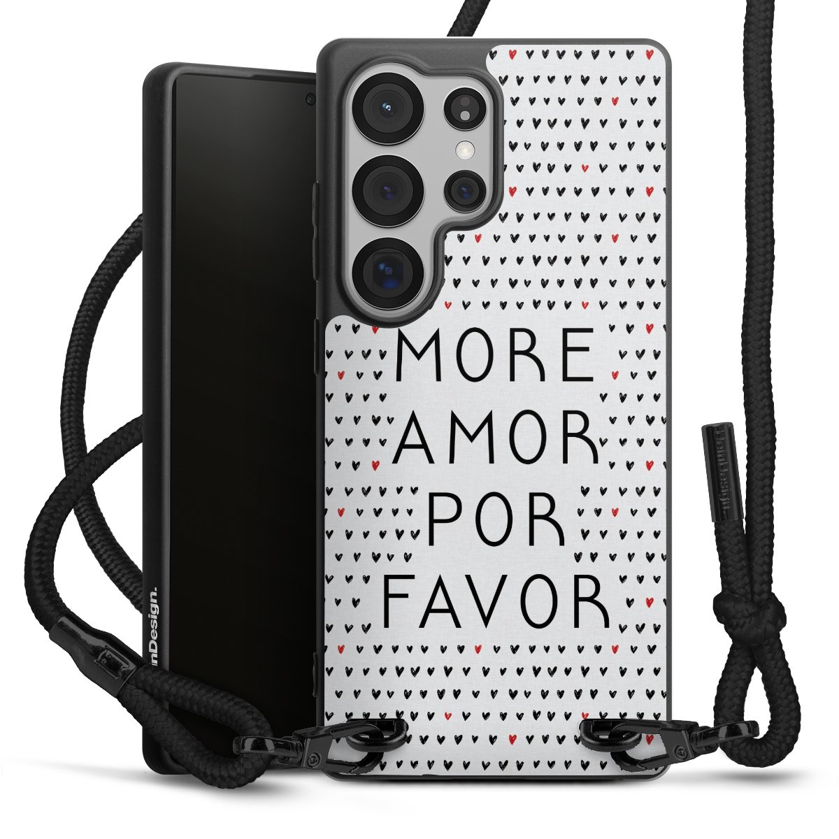 The matt black silicone case is made of flexible TPU (thermoplastic polyurethane) and offers robust protection. The durable, unbreakable material makes the cover flexible and dimensionally stable at the same time. The matte surface makes your design stand out more and is less susceptible to fingerprints and dirt. The stylish trend accessory fits comfortably in the hand and is perfectly complemented by the fabric (polyester) mobile phone strap. The braided fabric strap is approx. 1.70 metres long with a diameter of approx. 0.5 cm. Due to the special knotting technique, the length of the strap can be adjusted by simply pulling it, so that you can adapt it individually to your wishes. The practical case to wear around your neck is available with the fabric strap in black. As a little icing on the cake, we have provided the strap with a chic metal fastener in matt black. The strap is securely fastened to the case with loops made of high-quality genuine leather and press studs. The ends of the fabric strap are covered with metallic end caps and thus protected from fraying.