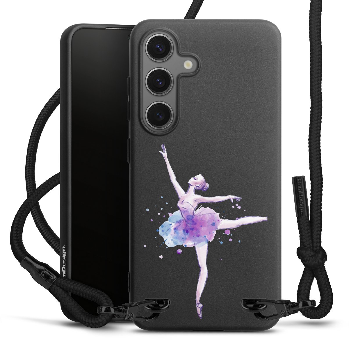 The matt black silicone case is made of flexible TPU (thermoplastic polyurethane) and offers robust protection. The durable, unbreakable material makes the cover flexible and dimensionally stable at the same time. The matte surface makes your design stand out more and is less susceptible to fingerprints and dirt. The stylish trend accessory fits comfortably in the hand and is perfectly complemented by the fabric (polyester) mobile phone strap. The braided fabric strap is approx. 1.70 metres long with a diameter of approx. 0.5 cm. Due to the special knotting technique, the length of the strap can be adjusted by simply pulling it, so that you can adapt it individually to your wishes. The practical case to wear around your neck is available with the fabric strap in black. As a little icing on the cake, we have provided the strap with a chic metal fastener in matt black. The strap is securely fastened to the case with loops made of high-quality genuine leather and press studs. The ends of the fabric strap are covered with metallic end caps and thus protected from fraying.