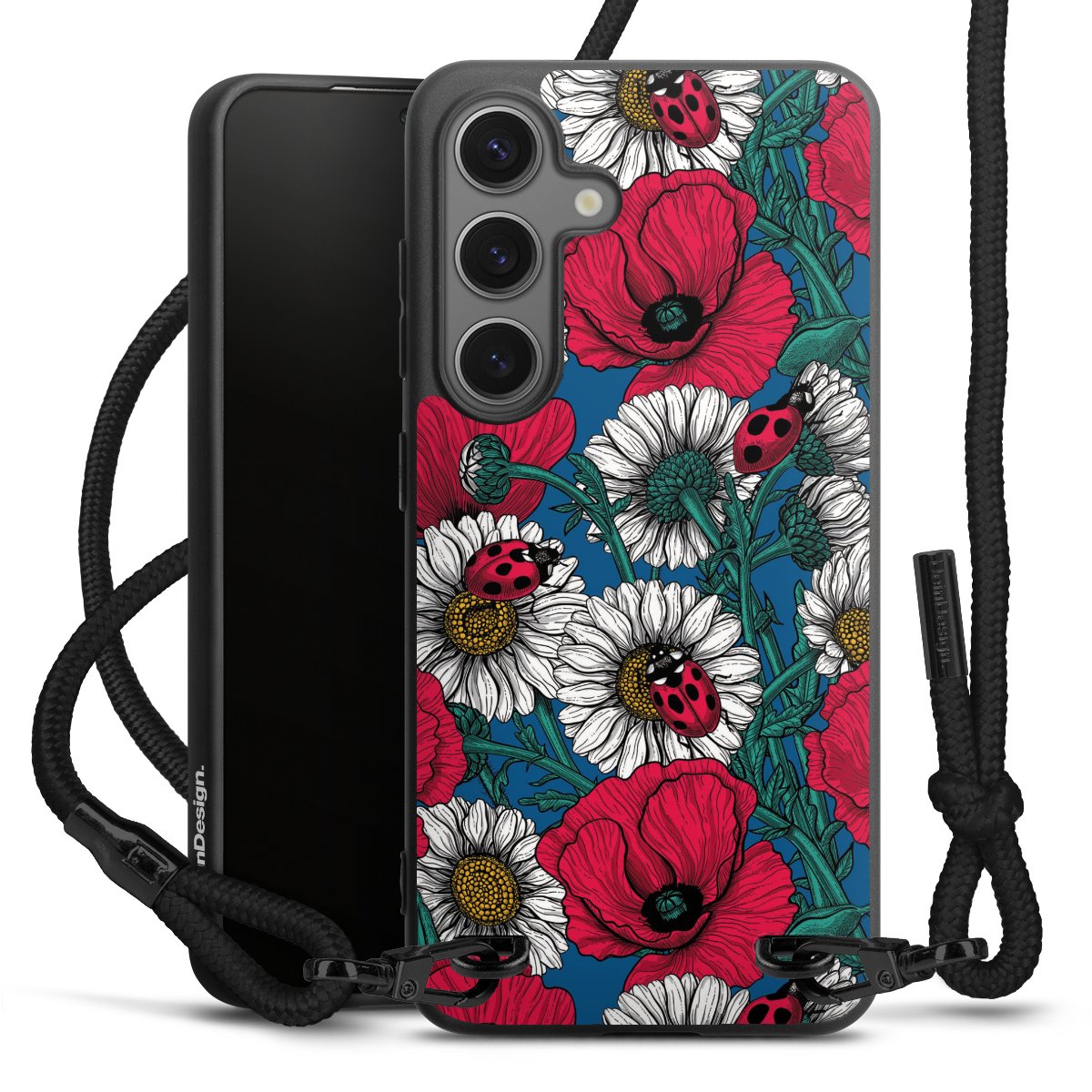 The matt black silicone case is made of flexible TPU (thermoplastic polyurethane) and offers robust protection. The durable, unbreakable material makes the cover flexible and dimensionally stable at the same time. The matte surface makes your design stand out more and is less susceptible to fingerprints and dirt. The stylish trend accessory fits comfortably in the hand and is perfectly complemented by the fabric (polyester) mobile phone strap. The braided fabric strap is approx. 1.70 metres long with a diameter of approx. 0.5 cm. Due to the special knotting technique, the length of the strap can be adjusted by simply pulling it, so that you can adapt it individually to your wishes. The practical case to wear around your neck is available with the fabric strap in black. As a little icing on the cake, we have provided the strap with a chic metal fastener in matt black. The strap is securely fastened to the case with loops made of high-quality genuine leather and press studs. The ends of the fabric strap are covered with metallic end caps and thus protected from fraying.