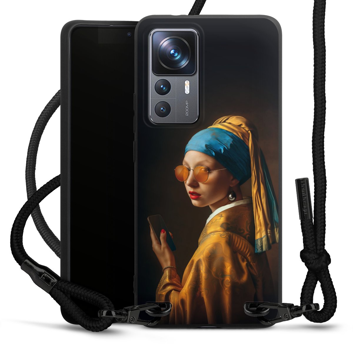 The matt black silicone case is made of flexible TPU (thermoplastic polyurethane) and offers robust protection. The durable, unbreakable material makes the cover flexible and dimensionally stable at the same time. The matte surface makes your design stand out more and is less susceptible to fingerprints and dirt. The stylish trend accessory fits comfortably in the hand and is perfectly complemented by the fabric (polyester) mobile phone strap. The braided fabric strap is approx. 1.70 metres long with a diameter of approx. 0.5 cm. Due to the special knotting technique, the length of the strap can be adjusted by simply pulling it, so that you can adapt it individually to your wishes. The practical case to wear around your neck is available with the fabric strap in black. As a little icing on the cake, we have provided the strap with a chic metal fastener in matt black. The strap is securely fastened to the case with loops made of high-quality genuine leather and press studs. The ends of the fabric strap are covered with metallic end caps and thus protected from fraying.