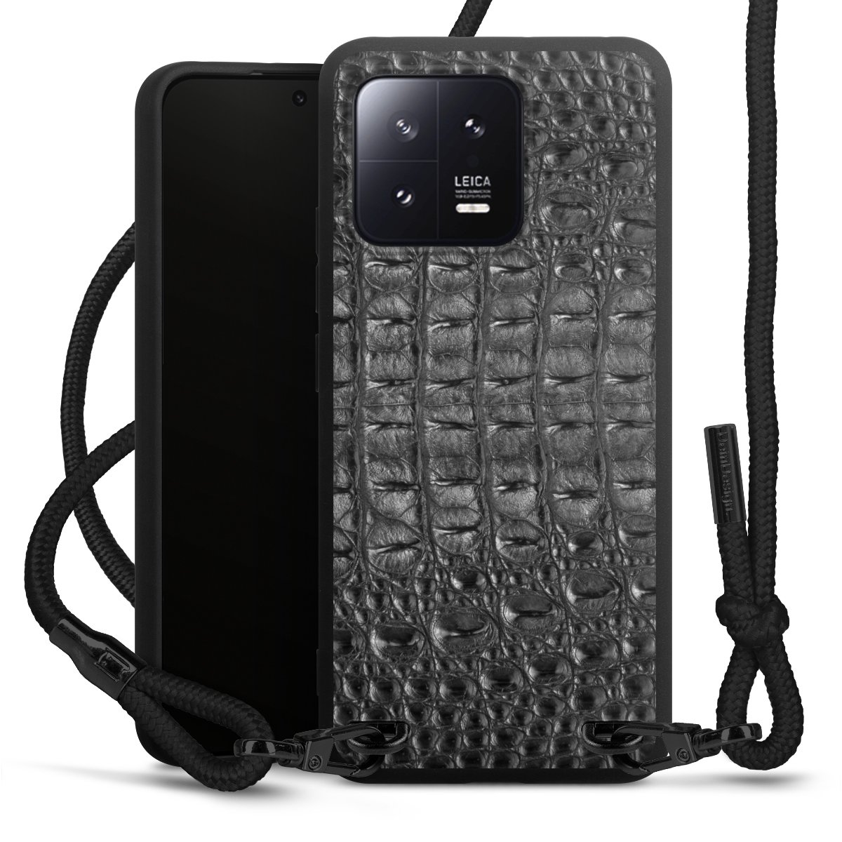 The matt black silicone case is made of flexible TPU (thermoplastic polyurethane) and offers robust protection. The durable, unbreakable material makes the cover flexible and dimensionally stable at the same time. The matte surface makes your design stand out more and is less susceptible to fingerprints and dirt. The stylish trend accessory fits comfortably in the hand and is perfectly complemented by the fabric (polyester) mobile phone strap. The braided fabric strap is approx. 1.70 metres long with a diameter of approx. 0.5 cm. Due to the special knotting technique, the length of the strap can be adjusted by simply pulling it, so that you can adapt it individually to your wishes. The practical case to wear around your neck is available with the fabric strap in black. As a little icing on the cake, we have provided the strap with a chic metal fastener in matt black. The strap is securely fastened to the case with loops made of high-quality genuine leather and press studs. The ends of the fabric strap are covered with metallic end caps and thus protected from fraying.