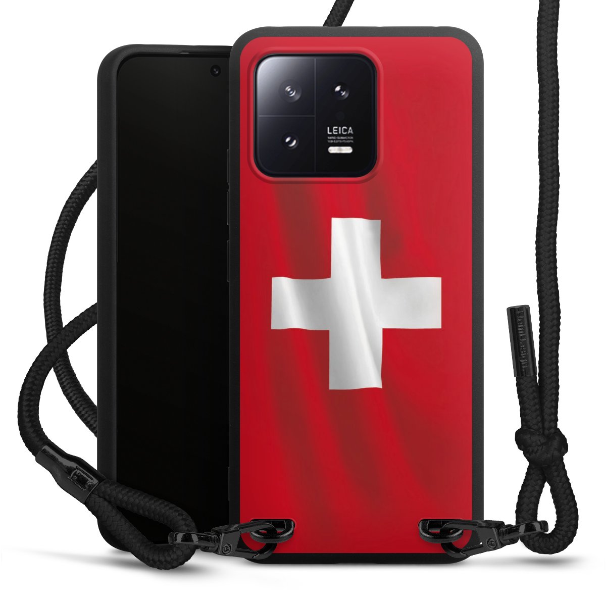 The matt black silicone case is made of flexible TPU (thermoplastic polyurethane) and offers robust protection. The durable, unbreakable material makes the cover flexible and dimensionally stable at the same time. The matte surface makes your design stand out more and is less susceptible to fingerprints and dirt. The stylish trend accessory fits comfortably in the hand and is perfectly complemented by the fabric (polyester) mobile phone strap. The braided fabric strap is approx. 1.70 metres long with a diameter of approx. 0.5 cm. Due to the special knotting technique, the length of the strap can be adjusted by simply pulling it, so that you can adapt it individually to your wishes. The practical case to wear around your neck is available with the fabric strap in black. As a little icing on the cake, we have provided the strap with a chic metal fastener in matt black. The strap is securely fastened to the case with loops made of high-quality genuine leather and press studs. The ends of the fabric strap are covered with metallic end caps and thus protected from fraying.