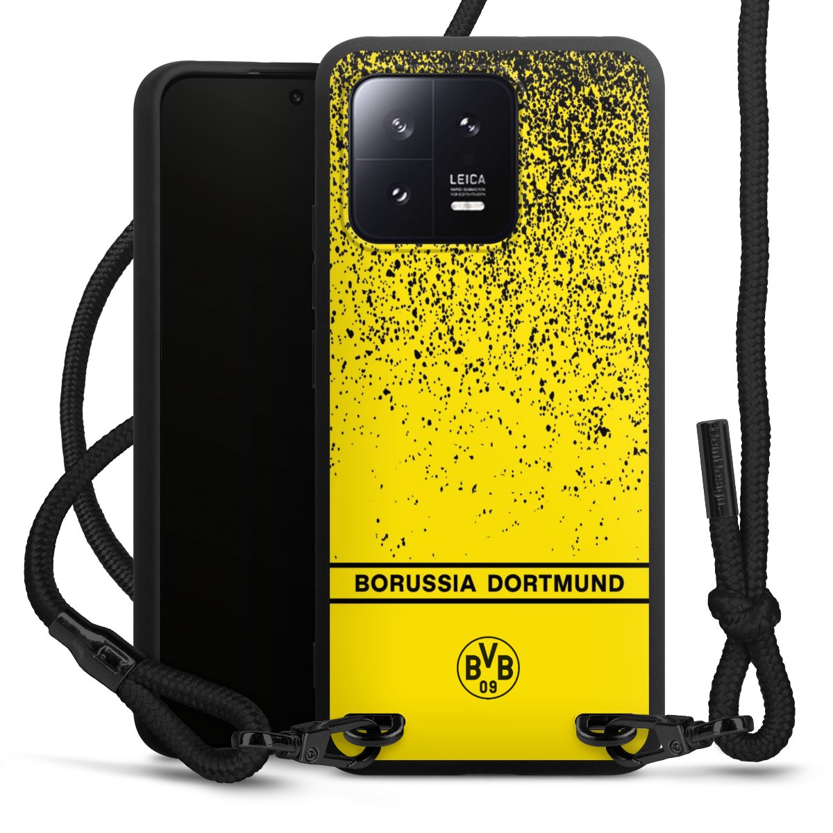The matt black silicone case is made of flexible TPU (thermoplastic polyurethane) and offers robust protection. The durable, unbreakable material makes the cover flexible and dimensionally stable at the same time. The matte surface makes your design stand out more and is less susceptible to fingerprints and dirt. The stylish trend accessory fits comfortably in the hand and is perfectly complemented by the fabric (polyester) mobile phone strap. The braided fabric strap is approx. 1.70 metres long with a diameter of approx. 0.5 cm. Due to the special knotting technique, the length of the strap can be adjusted by simply pulling it, so that you can adapt it individually to your wishes. The practical case to wear around your neck is available with the fabric strap in black. As a little icing on the cake, we have provided the strap with a chic metal fastener in matt black. The strap is securely fastened to the case with loops made of high-quality genuine leather and press studs. The ends of the fabric strap are covered with metallic end caps and thus protected from fraying.