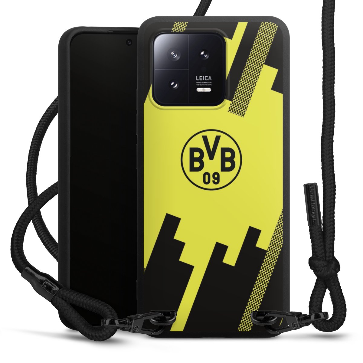 The matt black silicone case is made of flexible TPU (thermoplastic polyurethane) and offers robust protection. The durable, unbreakable material makes the cover flexible and dimensionally stable at the same time. The matte surface makes your design stand out more and is less susceptible to fingerprints and dirt. The stylish trend accessory fits comfortably in the hand and is perfectly complemented by the fabric (polyester) mobile phone strap. The braided fabric strap is approx. 1.70 metres long with a diameter of approx. 0.5 cm. Due to the special knotting technique, the length of the strap can be adjusted by simply pulling it, so that you can adapt it individually to your wishes. The practical case to wear around your neck is available with the fabric strap in black. As a little icing on the cake, we have provided the strap with a chic metal fastener in matt black. The strap is securely fastened to the case with loops made of high-quality genuine leather and press studs. The ends of the fabric strap are covered with metallic end caps and thus protected from fraying.