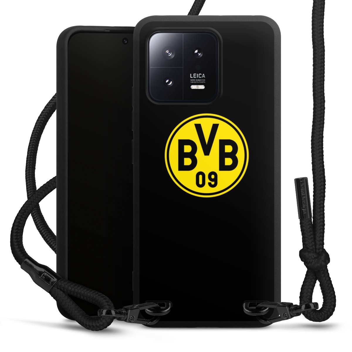 The matt black silicone case is made of flexible TPU (thermoplastic polyurethane) and offers robust protection. The durable, unbreakable material makes the cover flexible and dimensionally stable at the same time. The matte surface makes your design stand out more and is less susceptible to fingerprints and dirt. The stylish trend accessory fits comfortably in the hand and is perfectly complemented by the fabric (polyester) mobile phone strap. The braided fabric strap is approx. 1.70 metres long with a diameter of approx. 0.5 cm. Due to the special knotting technique, the length of the strap can be adjusted by simply pulling it, so that you can adapt it individually to your wishes. The practical case to wear around your neck is available with the fabric strap in black. As a little icing on the cake, we have provided the strap with a chic metal fastener in matt black. The strap is securely fastened to the case with loops made of high-quality genuine leather and press studs. The ends of the fabric strap are covered with metallic end caps and thus protected from fraying.