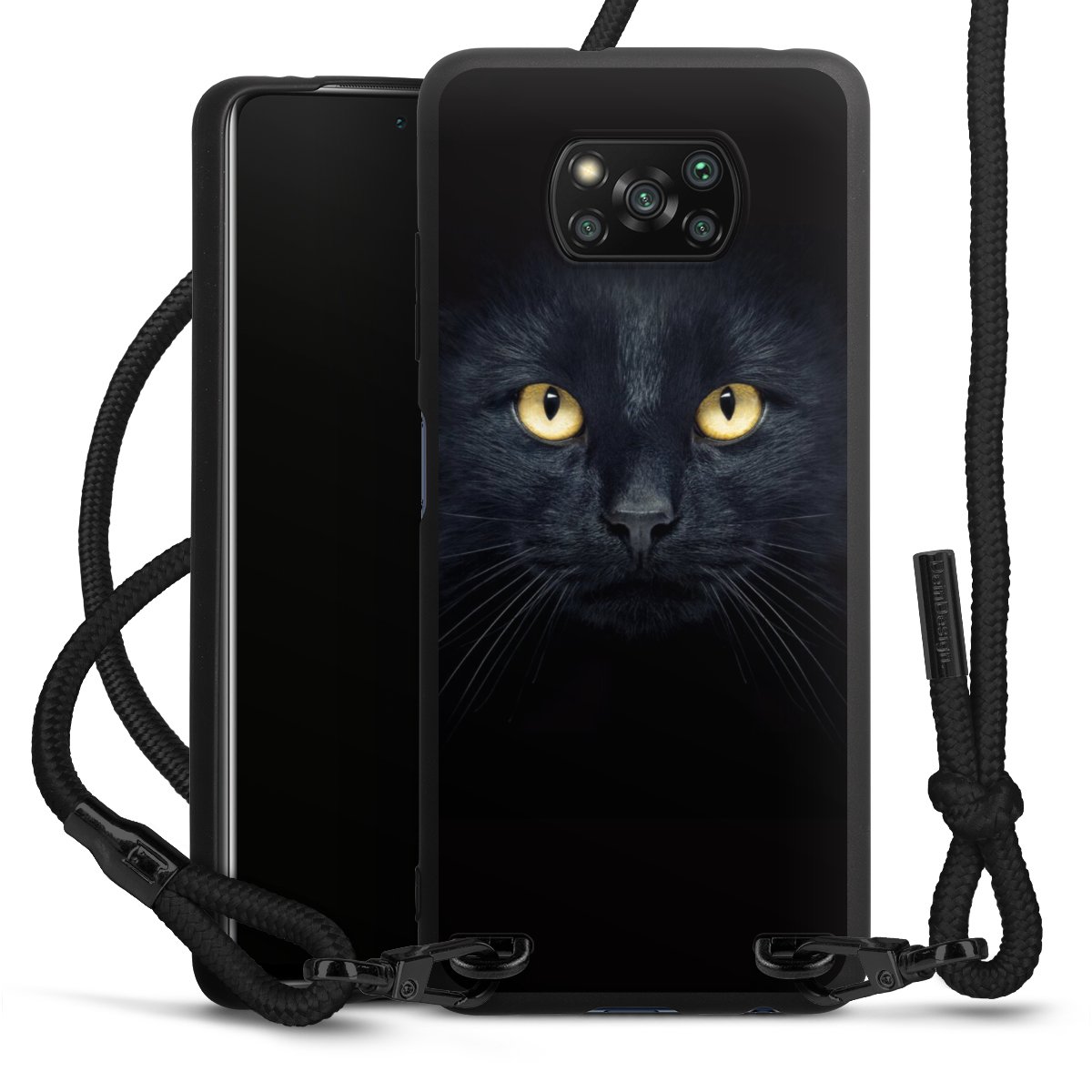 The matt black silicone case is made of flexible TPU (thermoplastic polyurethane) and offers robust protection. The durable, unbreakable material makes the cover flexible and dimensionally stable at the same time. The matte surface makes your design stand out more and is less susceptible to fingerprints and dirt. The stylish trend accessory fits comfortably in the hand and is perfectly complemented by the fabric (polyester) mobile phone strap. The braided fabric strap is approx. 1.70 metres long with a diameter of approx. 0.5 cm. Due to the special knotting technique, the length of the strap can be adjusted by simply pulling it, so that you can adapt it individually to your wishes. The practical case to wear around your neck is available with the fabric strap in black. As a little icing on the cake, we have provided the strap with a chic metal fastener in matt black. The strap is securely fastened to the case with loops made of high-quality genuine leather and press studs. The ends of the fabric strap are covered with metallic end caps and thus protected from fraying.