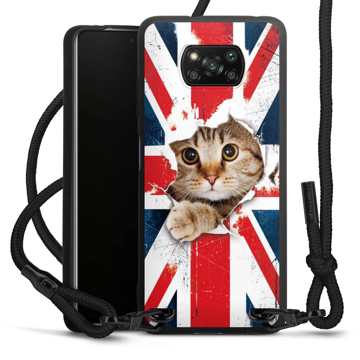 The matt black silicone case is made of flexible TPU (thermoplastic polyurethane) and offers robust protection. The durable, unbreakable material makes the cover flexible and dimensionally stable at the same time. The matte surface makes your design stand out more and is less susceptible to fingerprints and dirt. The stylish trend accessory fits comfortably in the hand and is perfectly complemented by the fabric (polyester) mobile phone strap. The braided fabric strap is approx. 1.70 metres long with a diameter of approx. 0.5 cm. Due to the special knotting technique, the length of the strap can be adjusted by simply pulling it, so that you can adapt it individually to your wishes. The practical case to wear around your neck is available with the fabric strap in black. As a little icing on the cake, we have provided the strap with a chic metal fastener in matt black. The strap is securely fastened to the case with loops made of high-quality genuine leather and press studs. The ends of the fabric strap are covered with metallic end caps and thus protected from fraying.