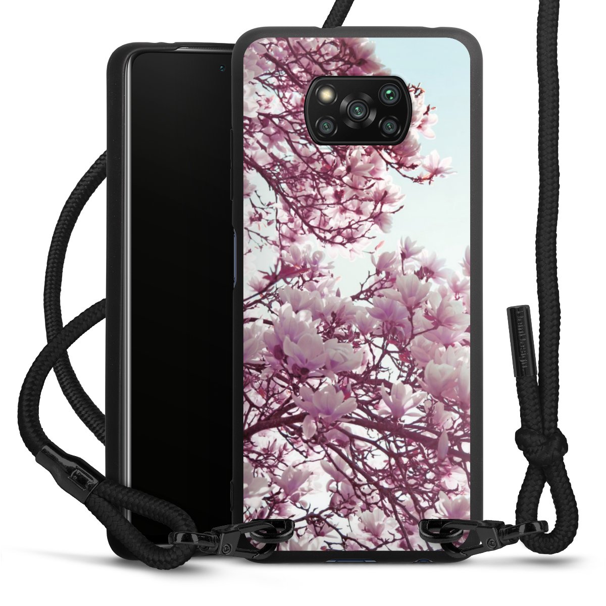 The matt black silicone case is made of flexible TPU (thermoplastic polyurethane) and offers robust protection. The durable, unbreakable material makes the cover flexible and dimensionally stable at the same time. The matte surface makes your design stand out more and is less susceptible to fingerprints and dirt. The stylish trend accessory fits comfortably in the hand and is perfectly complemented by the fabric (polyester) mobile phone strap. The braided fabric strap is approx. 1.70 metres long with a diameter of approx. 0.5 cm. Due to the special knotting technique, the length of the strap can be adjusted by simply pulling it, so that you can adapt it individually to your wishes. The practical case to wear around your neck is available with the fabric strap in black. As a little icing on the cake, we have provided the strap with a chic metal fastener in matt black. The strap is securely fastened to the case with loops made of high-quality genuine leather and press studs. The ends of the fabric strap are covered with metallic end caps and thus protected from fraying.