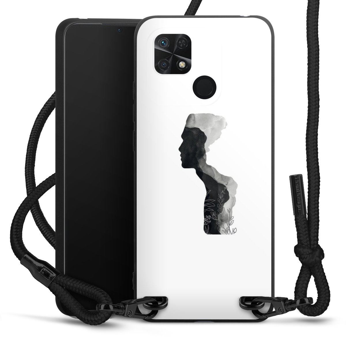 The matt black silicone case is made of flexible TPU (thermoplastic polyurethane) and offers robust protection. The durable, unbreakable material makes the cover flexible and dimensionally stable at the same time. The matte surface makes your design stand out more and is less susceptible to fingerprints and dirt. The stylish trend accessory fits comfortably in the hand and is perfectly complemented by the fabric (polyester) mobile phone strap. The braided fabric strap is approx. 1.70 metres long with a diameter of approx. 0.5 cm. Due to the special knotting technique, the length of the strap can be adjusted by simply pulling it, so that you can adapt it individually to your wishes. The practical case to wear around your neck is available with the fabric strap in black. As a little icing on the cake, we have provided the strap with a chic metal fastener in matt black. The strap is securely fastened to the case with loops made of high-quality genuine leather and press studs. The ends of the fabric strap are covered with metallic end caps and thus protected from fraying.