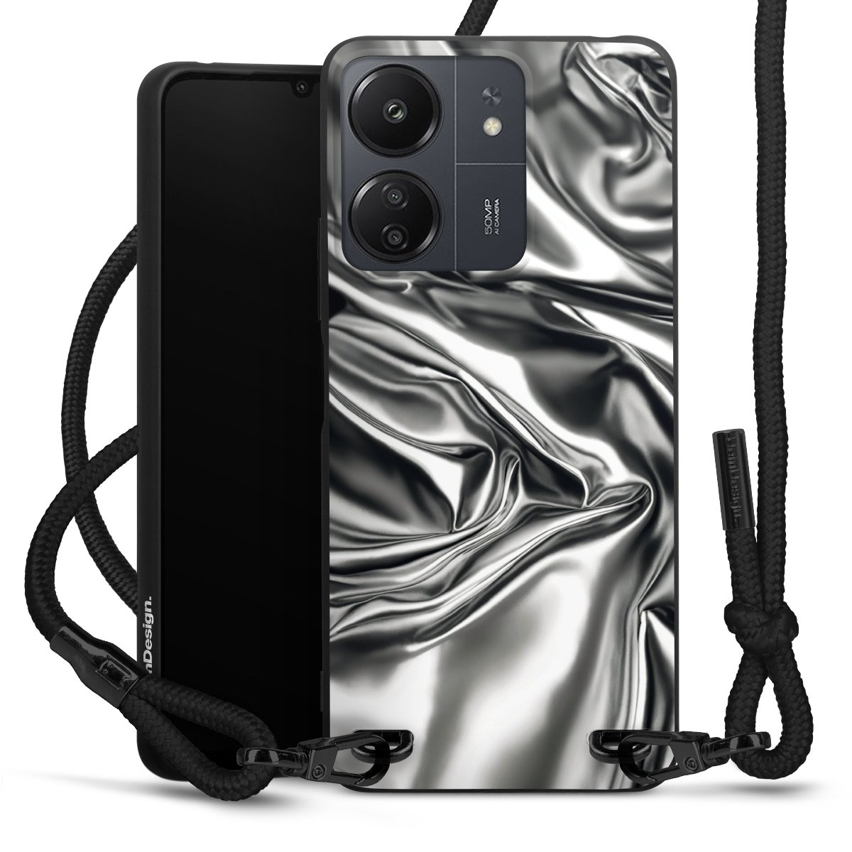 The matt black silicone case is made of flexible TPU (thermoplastic polyurethane) and offers robust protection. The durable, unbreakable material makes the cover flexible and dimensionally stable at the same time. The matte surface makes your design stand out more and is less susceptible to fingerprints and dirt. The stylish trend accessory fits comfortably in the hand and is perfectly complemented by the fabric (polyester) mobile phone strap. The braided fabric strap is approx. 1.70 metres long with a diameter of approx. 0.5 cm. Due to the special knotting technique, the length of the strap can be adjusted by simply pulling it, so that you can adapt it individually to your wishes. The practical case to wear around your neck is available with the fabric strap in black. As a little icing on the cake, we have provided the strap with a chic metal fastener in matt black. The strap is securely fastened to the case with loops made of high-quality genuine leather and press studs. The ends of the fabric strap are covered with metallic end caps and thus protected from fraying.