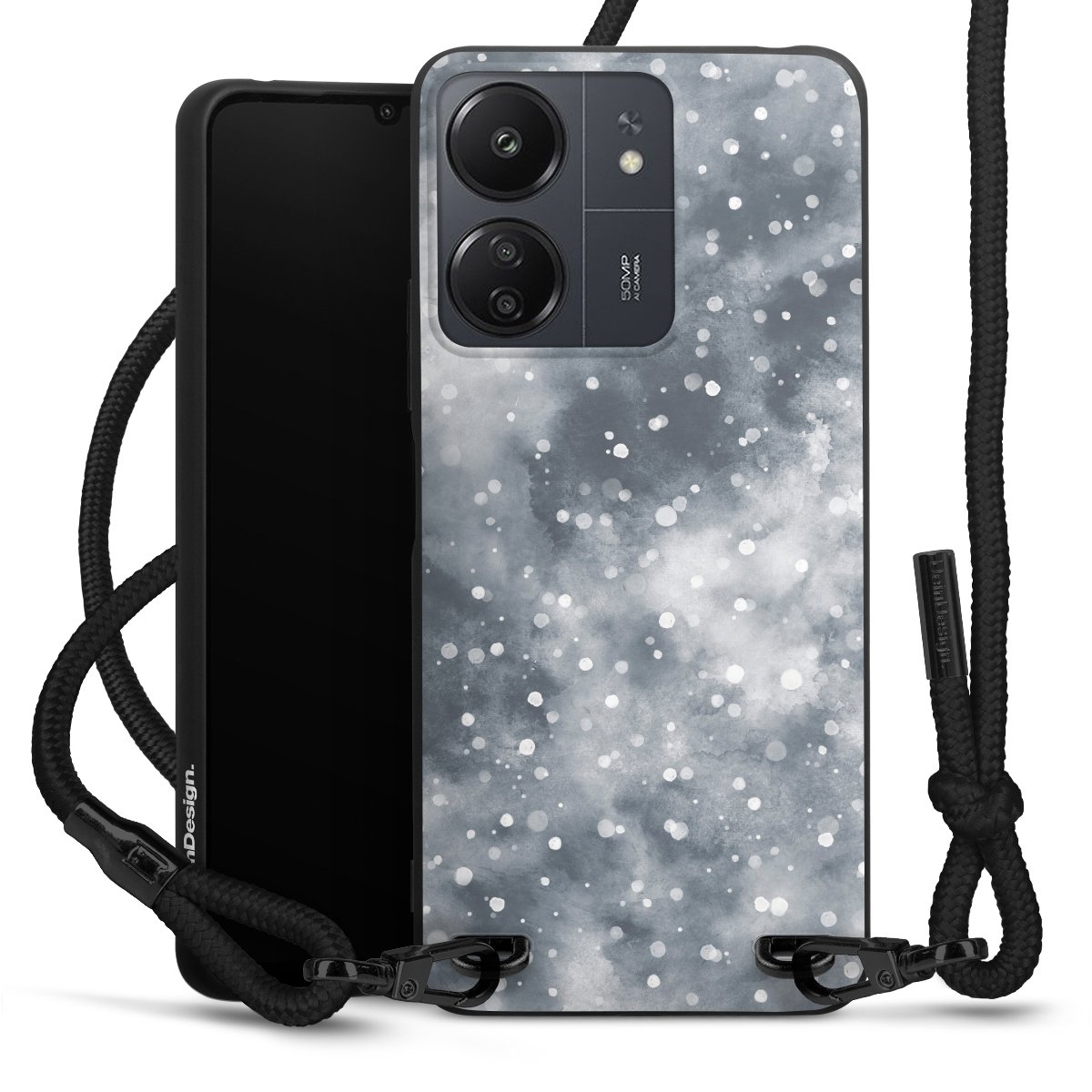 The matt black silicone case is made of flexible TPU (thermoplastic polyurethane) and offers robust protection. The durable, unbreakable material makes the cover flexible and dimensionally stable at the same time. The matte surface makes your design stand out more and is less susceptible to fingerprints and dirt. The stylish trend accessory fits comfortably in the hand and is perfectly complemented by the fabric (polyester) mobile phone strap. The braided fabric strap is approx. 1.70 metres long with a diameter of approx. 0.5 cm. Due to the special knotting technique, the length of the strap can be adjusted by simply pulling it, so that you can adapt it individually to your wishes. The practical case to wear around your neck is available with the fabric strap in black. As a little icing on the cake, we have provided the strap with a chic metal fastener in matt black. The strap is securely fastened to the case with loops made of high-quality genuine leather and press studs. The ends of the fabric strap are covered with metallic end caps and thus protected from fraying.