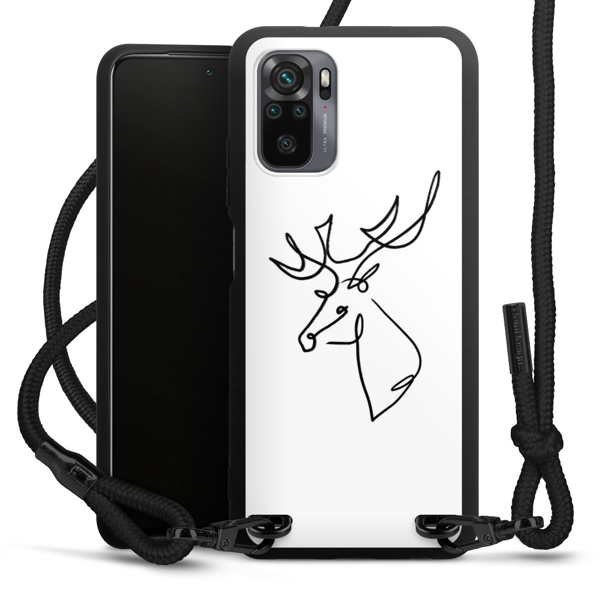 The matt black silicone case is made of flexible TPU (thermoplastic polyurethane) and offers robust protection. The durable, unbreakable material makes the cover flexible and dimensionally stable at the same time. The matte surface makes your design stand out more and is less susceptible to fingerprints and dirt. The stylish trend accessory fits comfortably in the hand and is perfectly complemented by the fabric (polyester) mobile phone strap. The braided fabric strap is approx. 1.70 metres long with a diameter of approx. 0.5 cm. Due to the special knotting technique, the length of the strap can be adjusted by simply pulling it, so that you can adapt it individually to your wishes. The practical case to wear around your neck is available with the fabric strap in black. As a little icing on the cake, we have provided the strap with a chic metal fastener in matt black. The strap is securely fastened to the case with loops made of high-quality genuine leather and press studs. The ends of the fabric strap are covered with metallic end caps and thus protected from fraying.