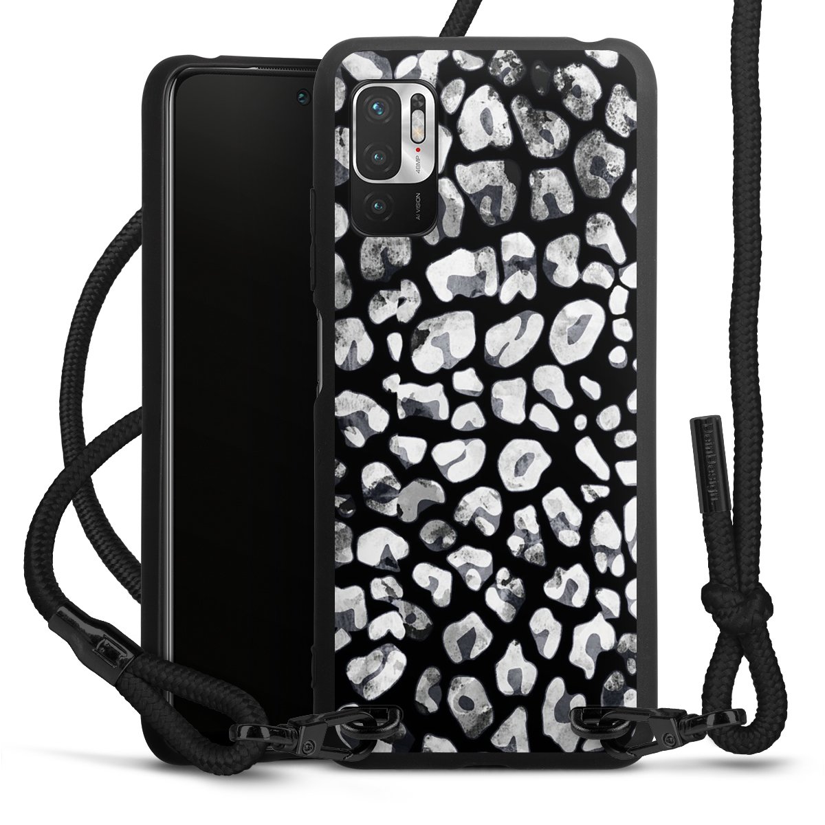 The matt black silicone case is made of flexible TPU (thermoplastic polyurethane) and offers robust protection. The durable, unbreakable material makes the cover flexible and dimensionally stable at the same time. The matte surface makes your design stand out more and is less susceptible to fingerprints and dirt. The stylish trend accessory fits comfortably in the hand and is perfectly complemented by the fabric (polyester) mobile phone strap. The braided fabric strap is approx. 1.70 metres long with a diameter of approx. 0.5 cm. Due to the special knotting technique, the length of the strap can be adjusted by simply pulling it, so that you can adapt it individually to your wishes. The practical case to wear around your neck is available with the fabric strap in black. As a little icing on the cake, we have provided the strap with a chic metal fastener in matt black. The strap is securely fastened to the case with loops made of high-quality genuine leather and press studs. The ends of the fabric strap are covered with metallic end caps and thus protected from fraying.