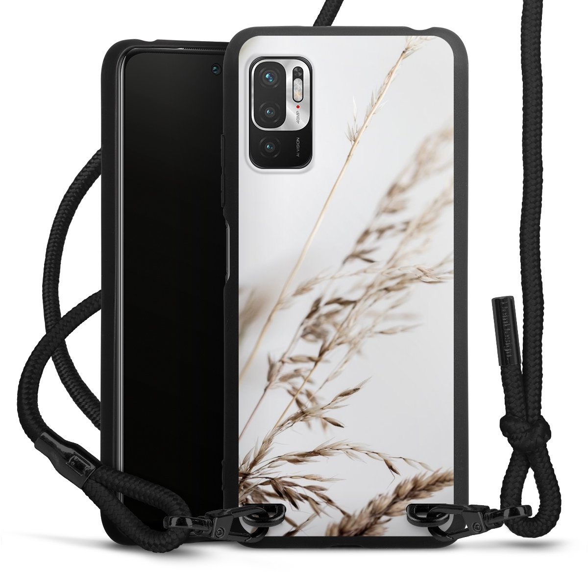 The matt black silicone case is made of flexible TPU (thermoplastic polyurethane) and offers robust protection. The durable, unbreakable material makes the cover flexible and dimensionally stable at the same time. The matte surface makes your design stand out more and is less susceptible to fingerprints and dirt. The stylish trend accessory fits comfortably in the hand and is perfectly complemented by the fabric (polyester) mobile phone strap. The braided fabric strap is approx. 1.70 metres long with a diameter of approx. 0.5 cm. Due to the special knotting technique, the length of the strap can be adjusted by simply pulling it, so that you can adapt it individually to your wishes. The practical case to wear around your neck is available with the fabric strap in black. As a little icing on the cake, we have provided the strap with a chic metal fastener in matt black. The strap is securely fastened to the case with loops made of high-quality genuine leather and press studs. The ends of the fabric strap are covered with metallic end caps and thus protected from fraying.