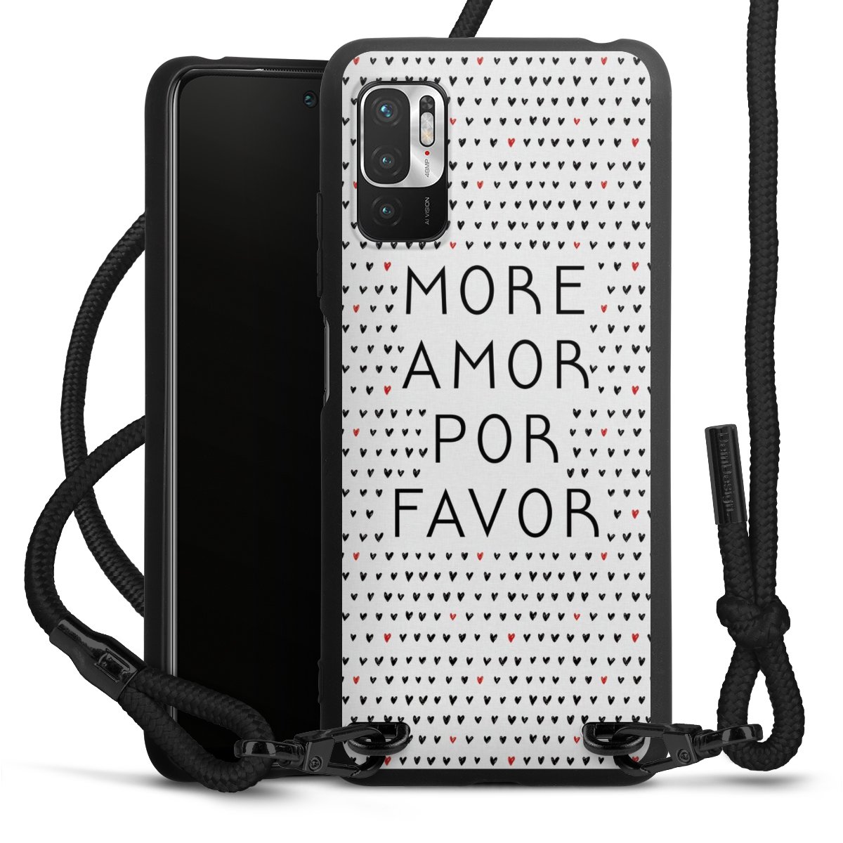The matt black silicone case is made of flexible TPU (thermoplastic polyurethane) and offers robust protection. The durable, unbreakable material makes the cover flexible and dimensionally stable at the same time. The matte surface makes your design stand out more and is less susceptible to fingerprints and dirt. The stylish trend accessory fits comfortably in the hand and is perfectly complemented by the fabric (polyester) mobile phone strap. The braided fabric strap is approx. 1.70 metres long with a diameter of approx. 0.5 cm. Due to the special knotting technique, the length of the strap can be adjusted by simply pulling it, so that you can adapt it individually to your wishes. The practical case to wear around your neck is available with the fabric strap in black. As a little icing on the cake, we have provided the strap with a chic metal fastener in matt black. The strap is securely fastened to the case with loops made of high-quality genuine leather and press studs. The ends of the fabric strap are covered with metallic end caps and thus protected from fraying.