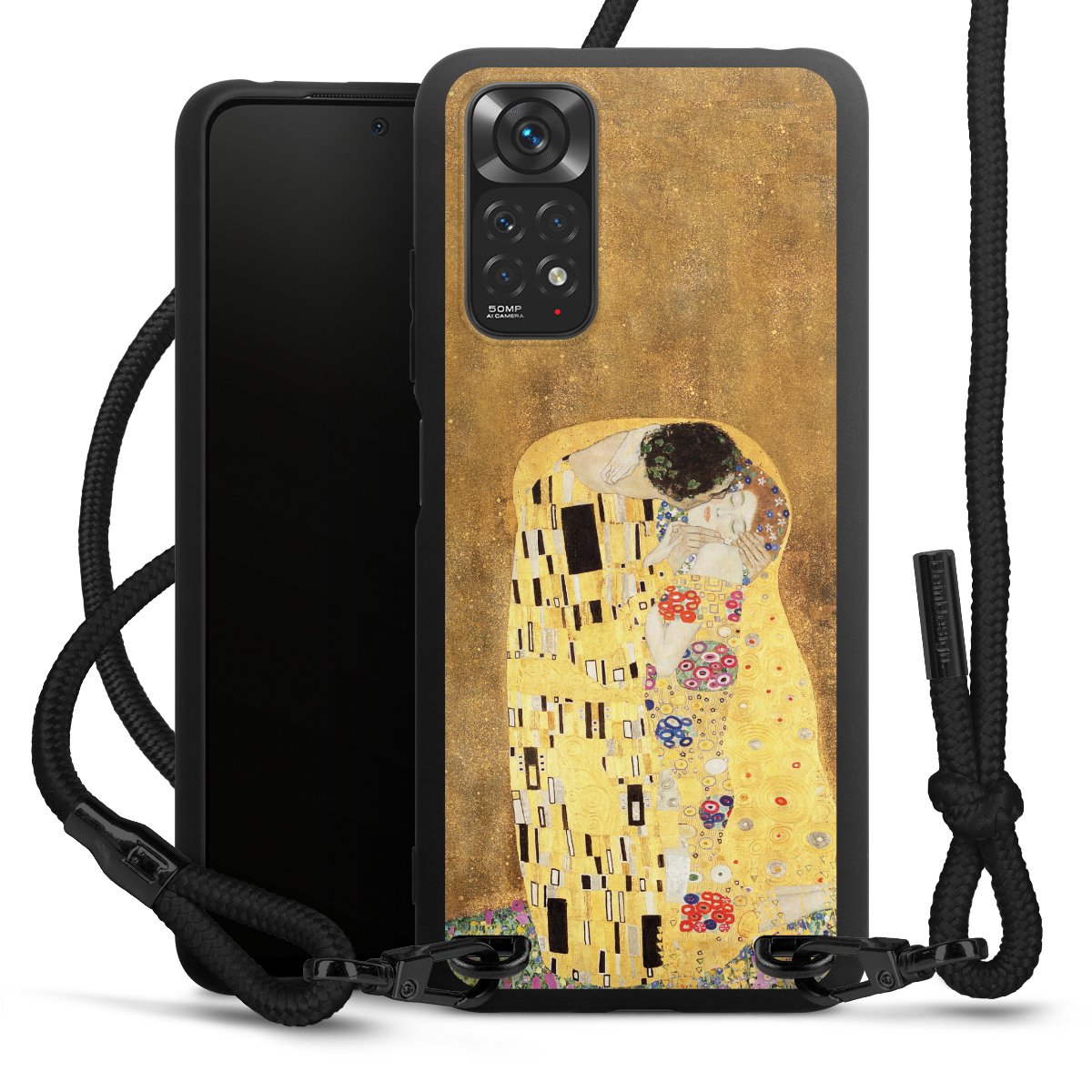 The matt black silicone case is made of flexible TPU (thermoplastic polyurethane) and offers robust protection. The durable, unbreakable material makes the cover flexible and dimensionally stable at the same time. The matte surface makes your design stand out more and is less susceptible to fingerprints and dirt. The stylish trend accessory fits comfortably in the hand and is perfectly complemented by the fabric (polyester) mobile phone strap. The braided fabric strap is approx. 1.70 metres long with a diameter of approx. 0.5 cm. Due to the special knotting technique, the length of the strap can be adjusted by simply pulling it, so that you can adapt it individually to your wishes. The practical case to wear around your neck is available with the fabric strap in black. As a little icing on the cake, we have provided the strap with a chic metal fastener in matt black. The strap is securely fastened to the case with loops made of high-quality genuine leather and press studs. The ends of the fabric strap are covered with metallic end caps and thus protected from fraying.