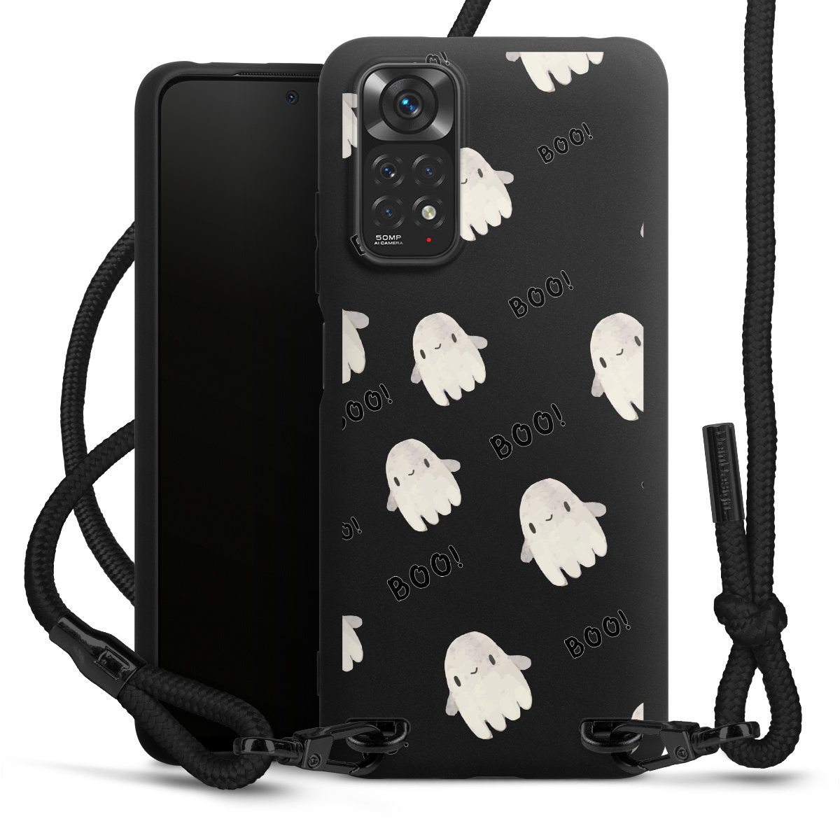 The matt black silicone case is made of flexible TPU (thermoplastic polyurethane) and offers robust protection. The durable, unbreakable material makes the cover flexible and dimensionally stable at the same time. The matte surface makes your design stand out more and is less susceptible to fingerprints and dirt. The stylish trend accessory fits comfortably in the hand and is perfectly complemented by the fabric (polyester) mobile phone strap. The braided fabric strap is approx. 1.70 metres long with a diameter of approx. 0.5 cm. Due to the special knotting technique, the length of the strap can be adjusted by simply pulling it, so that you can adapt it individually to your wishes. The practical case to wear around your neck is available with the fabric strap in black. As a little icing on the cake, we have provided the strap with a chic metal fastener in matt black. The strap is securely fastened to the case with loops made of high-quality genuine leather and press studs. The ends of the fabric strap are covered with metallic end caps and thus protected from fraying.