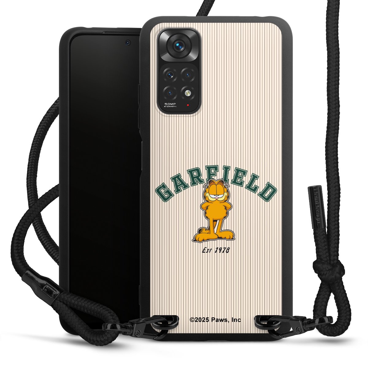 The matt black silicone case is made of flexible TPU (thermoplastic polyurethane) and offers robust protection. The durable, unbreakable material makes the cover flexible and dimensionally stable at the same time. The matte surface makes your design stand out more and is less susceptible to fingerprints and dirt. The stylish trend accessory fits comfortably in the hand and is perfectly complemented by the fabric (polyester) mobile phone strap. The braided fabric strap is approx. 1.70 metres long with a diameter of approx. 0.5 cm. Due to the special knotting technique, the length of the strap can be adjusted by simply pulling it, so that you can adapt it individually to your wishes. The practical case to wear around your neck is available with the fabric strap in black. As a little icing on the cake, we have provided the strap with a chic metal fastener in matt black. The strap is securely fastened to the case with loops made of high-quality genuine leather and press studs. The ends of the fabric strap are covered with metallic end caps and thus protected from fraying.