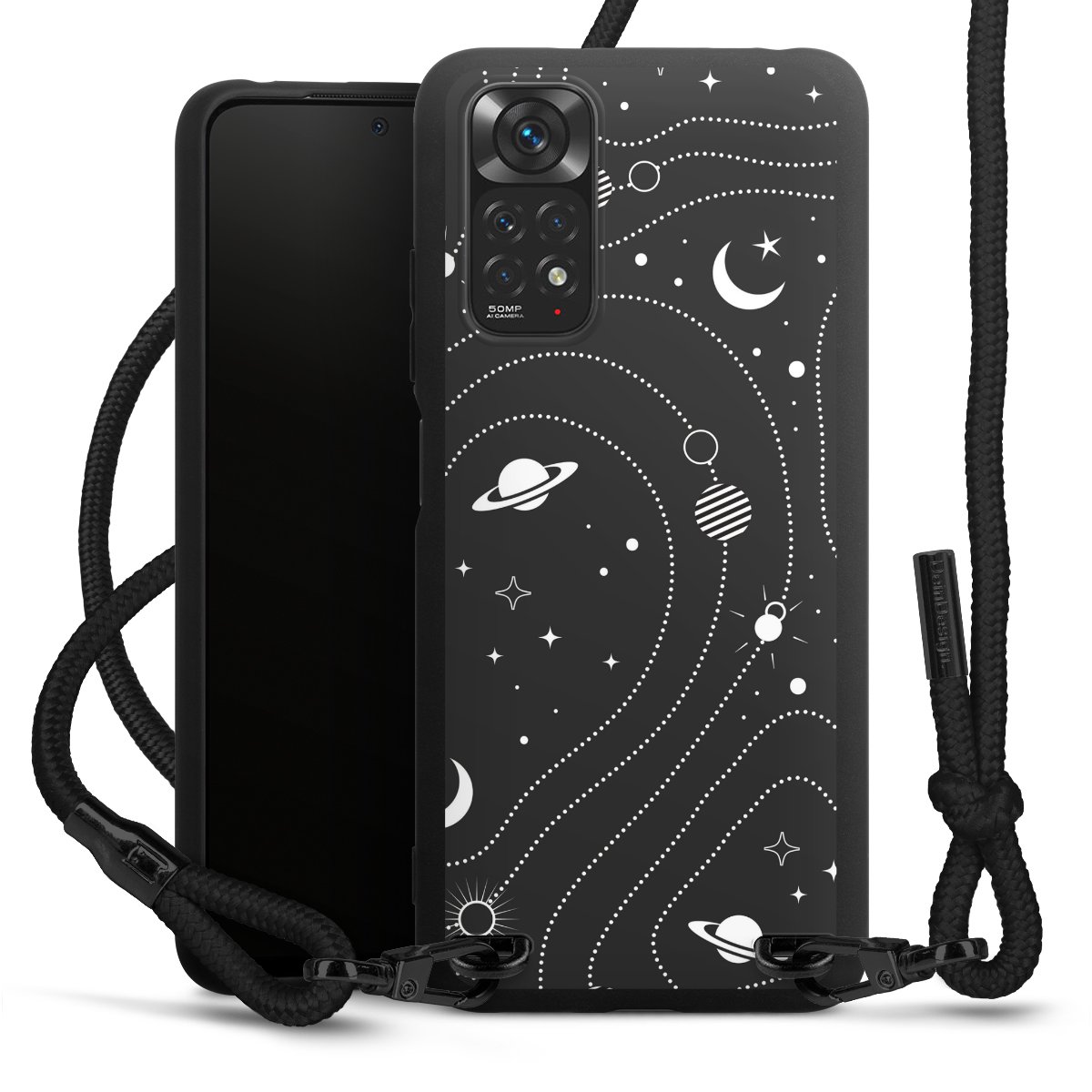The matt black silicone case is made of flexible TPU (thermoplastic polyurethane) and offers robust protection. The durable, unbreakable material makes the cover flexible and dimensionally stable at the same time. The matte surface makes your design stand out more and is less susceptible to fingerprints and dirt. The stylish trend accessory fits comfortably in the hand and is perfectly complemented by the fabric (polyester) mobile phone strap. The braided fabric strap is approx. 1.70 metres long with a diameter of approx. 0.5 cm. Due to the special knotting technique, the length of the strap can be adjusted by simply pulling it, so that you can adapt it individually to your wishes. The practical case to wear around your neck is available with the fabric strap in black. As a little icing on the cake, we have provided the strap with a chic metal fastener in matt black. The strap is securely fastened to the case with loops made of high-quality genuine leather and press studs. The ends of the fabric strap are covered with metallic end caps and thus protected from fraying.