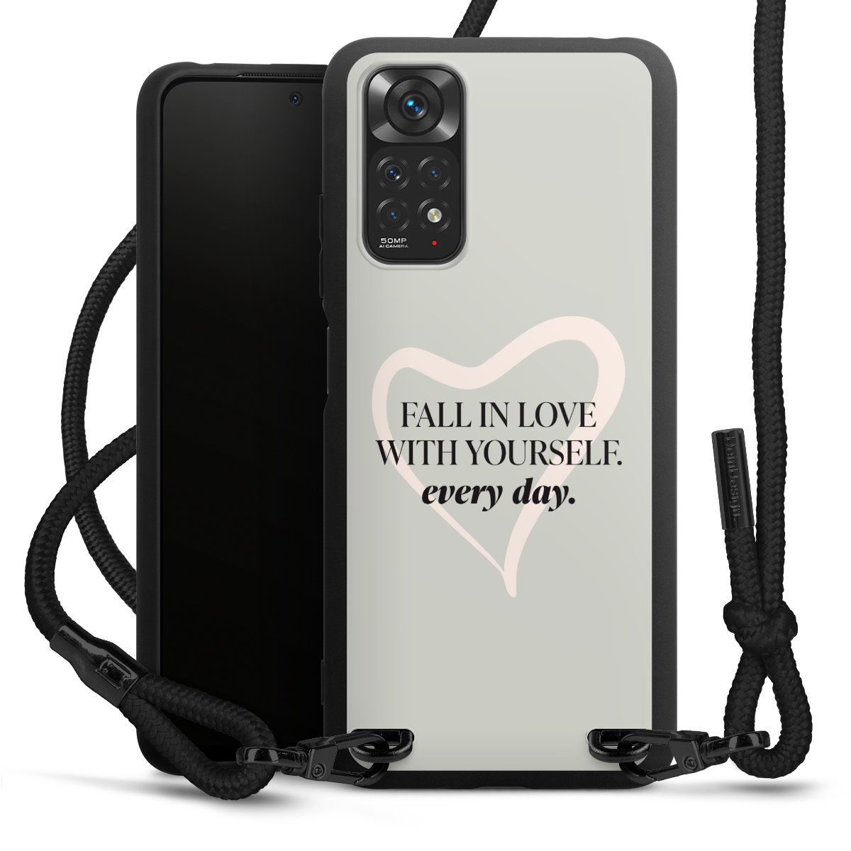 We use the solid direct print process for this phone case, which is why the print area only covers the back and the edge remains unprinted. The case to wear around your neck can be ordered unprinted, fully printed, or partially printed. For your design, either choose one of our exclusive shop motifs or get creative and create your own design, for example with photos and overlays. Design your own personal trend accessory and make an individual statement on the streets!