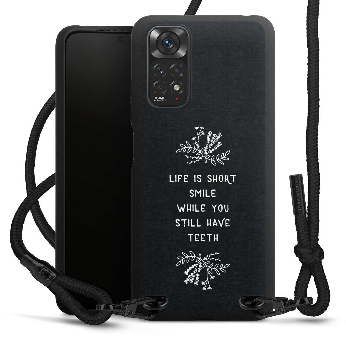 The matt black silicone case is made of flexible TPU (thermoplastic polyurethane) and offers robust protection. The durable, unbreakable material makes the cover flexible and dimensionally stable at the same time. The matte surface makes your design stand out more and is less susceptible to fingerprints and dirt. The stylish trend accessory fits comfortably in the hand and is perfectly complemented by the fabric (polyester) mobile phone strap. The braided fabric strap is approx. 1.70 metres long with a diameter of approx. 0.5 cm. Due to the special knotting technique, the length of the strap can be adjusted by simply pulling it, so that you can adapt it individually to your wishes. The practical case to wear around your neck is available with the fabric strap in black. As a little icing on the cake, we have provided the strap with a chic metal fastener in matt black. The strap is securely fastened to the case with loops made of high-quality genuine leather and press studs. The ends of the fabric strap are covered with metallic end caps and thus protected from fraying.