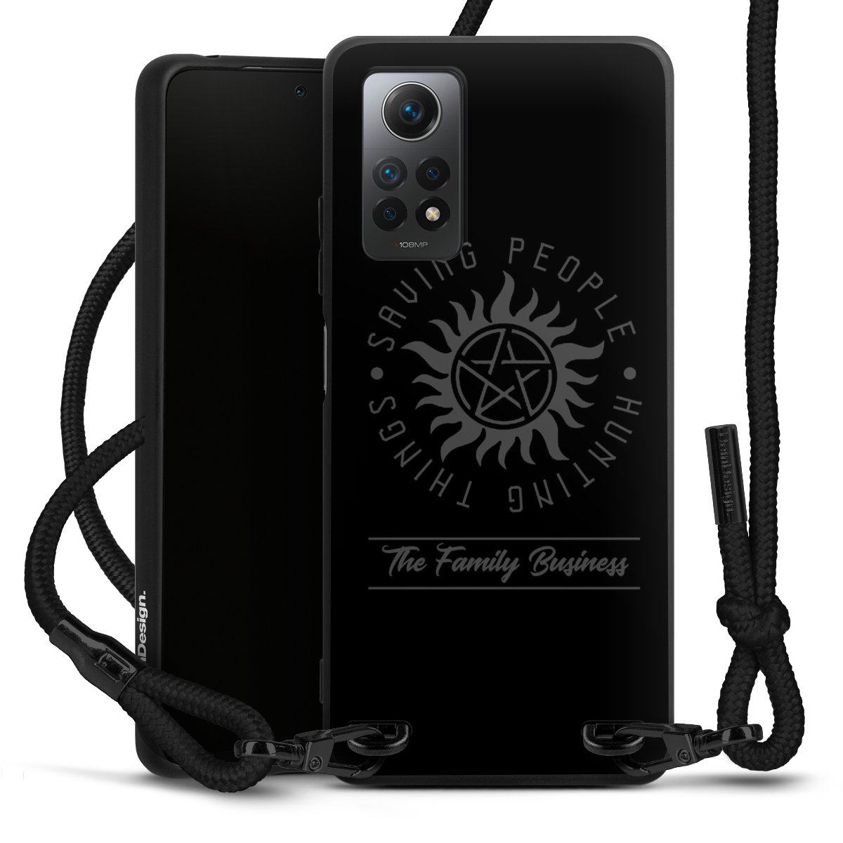 The matt black silicone case is made of flexible TPU (thermoplastic polyurethane) and offers robust protection. The durable, unbreakable material makes the cover flexible and dimensionally stable at the same time. The matte surface makes your design stand out more and is less susceptible to fingerprints and dirt. The stylish trend accessory fits comfortably in the hand and is perfectly complemented by the fabric (polyester) mobile phone strap. The braided fabric strap is approx. 1.70 metres long with a diameter of approx. 0.5 cm. Due to the special knotting technique, the length of the strap can be adjusted by simply pulling it, so that you can adapt it individually to your wishes. The practical case to wear around your neck is available with the fabric strap in black. As a little icing on the cake, we have provided the strap with a chic metal fastener in matt black. The strap is securely fastened to the case with loops made of high-quality genuine leather and press studs. The ends of the fabric strap are covered with metallic end caps and thus protected from fraying.