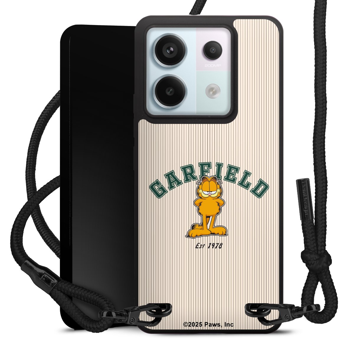 The matt black silicone case is made of flexible TPU (thermoplastic polyurethane) and offers robust protection. The durable, unbreakable material makes the cover flexible and dimensionally stable at the same time. The matte surface makes your design stand out more and is less susceptible to fingerprints and dirt. The stylish trend accessory fits comfortably in the hand and is perfectly complemented by the fabric (polyester) mobile phone strap. The braided fabric strap is approx. 1.70 metres long with a diameter of approx. 0.5 cm. Due to the special knotting technique, the length of the strap can be adjusted by simply pulling it, so that you can adapt it individually to your wishes. The practical case to wear around your neck is available with the fabric strap in black. As a little icing on the cake, we have provided the strap with a chic metal fastener in matt black. The strap is securely fastened to the case with loops made of high-quality genuine leather and press studs. The ends of the fabric strap are covered with metallic end caps and thus protected from fraying.