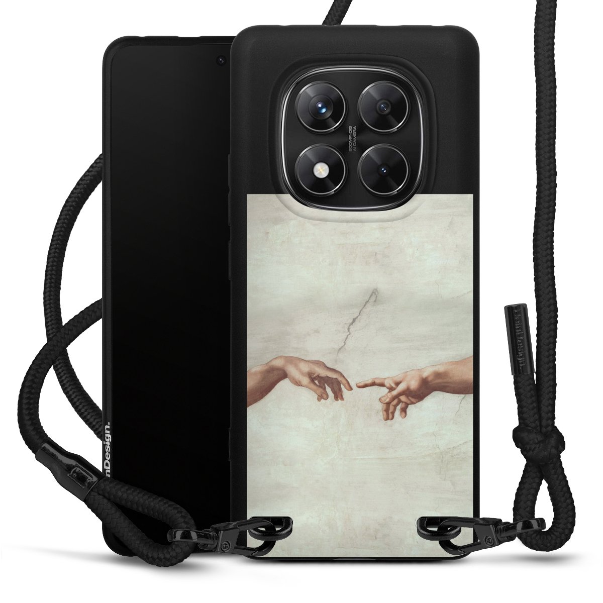 The matt black silicone case is made of flexible TPU (thermoplastic polyurethane) and offers robust protection. The durable, unbreakable material makes the cover flexible and dimensionally stable at the same time. The matte surface makes your design stand out more and is less susceptible to fingerprints and dirt. The stylish trend accessory fits comfortably in the hand and is perfectly complemented by the fabric (polyester) mobile phone strap. The braided fabric strap is approx. 1.70 metres long with a diameter of approx. 0.5 cm. Due to the special knotting technique, the length of the strap can be adjusted by simply pulling it, so that you can adapt it individually to your wishes. The practical case to wear around your neck is available with the fabric strap in black. As a little icing on the cake, we have provided the strap with a chic metal fastener in matt black. The strap is securely fastened to the case with loops made of high-quality genuine leather and press studs. The ends of the fabric strap are covered with metallic end caps and thus protected from fraying.