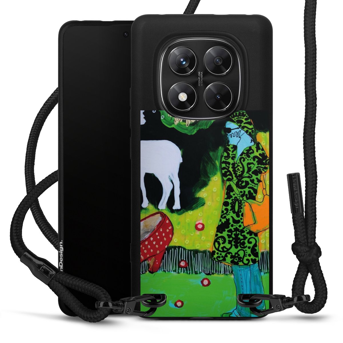 The matt black silicone case is made of flexible TPU (thermoplastic polyurethane) and offers robust protection. The durable, unbreakable material makes the cover flexible and dimensionally stable at the same time. The matte surface makes your design stand out more and is less susceptible to fingerprints and dirt. The stylish trend accessory fits comfortably in the hand and is perfectly complemented by the fabric (polyester) mobile phone strap. The braided fabric strap is approx. 1.70 metres long with a diameter of approx. 0.5 cm. Due to the special knotting technique, the length of the strap can be adjusted by simply pulling it, so that you can adapt it individually to your wishes. The practical case to wear around your neck is available with the fabric strap in black. As a little icing on the cake, we have provided the strap with a chic metal fastener in matt black. The strap is securely fastened to the case with loops made of high-quality genuine leather and press studs. The ends of the fabric strap are covered with metallic end caps and thus protected from fraying.