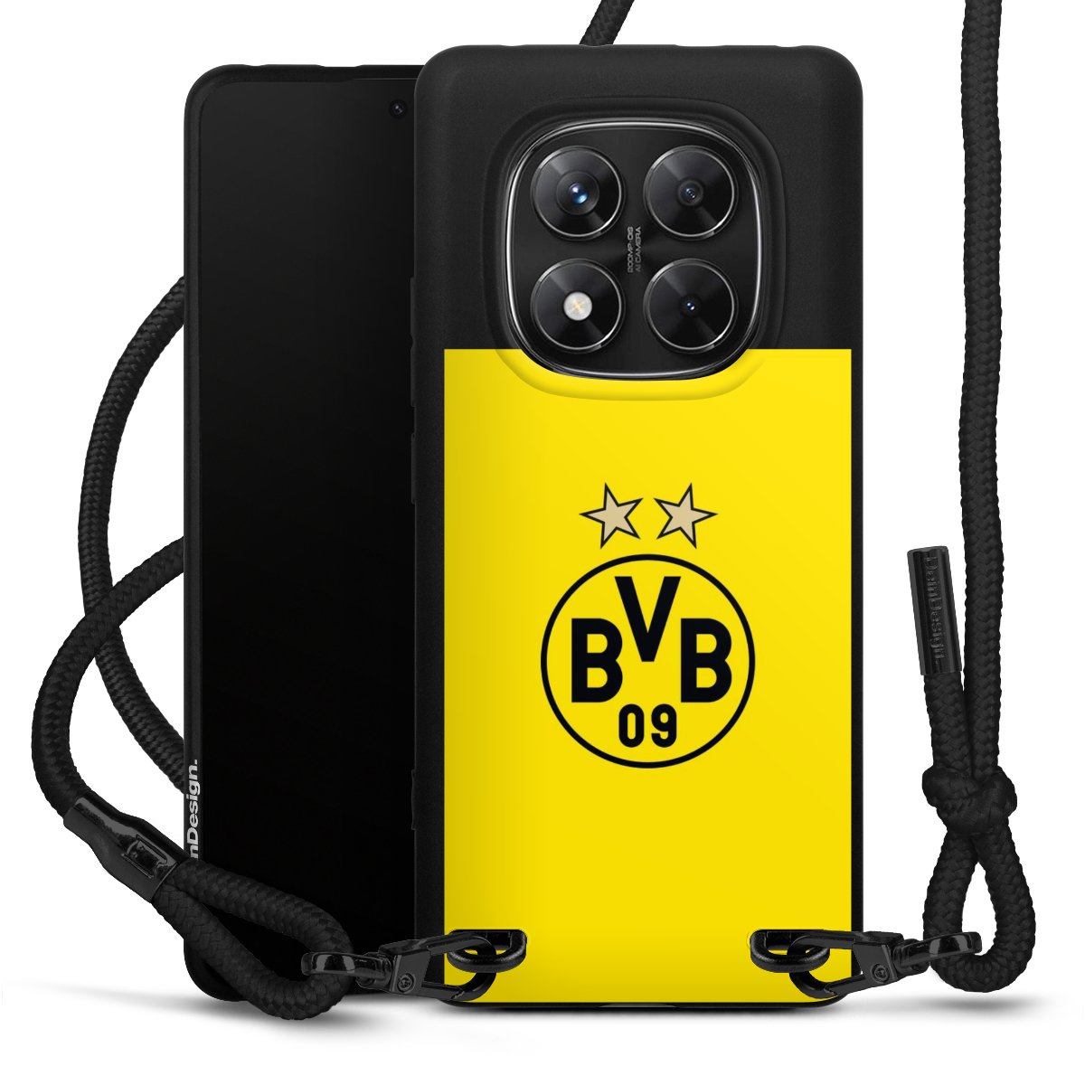 The matt black silicone case is made of flexible TPU (thermoplastic polyurethane) and offers robust protection. The durable, unbreakable material makes the cover flexible and dimensionally stable at the same time. The matte surface makes your design stand out more and is less susceptible to fingerprints and dirt. The stylish trend accessory fits comfortably in the hand and is perfectly complemented by the fabric (polyester) mobile phone strap. The braided fabric strap is approx. 1.70 metres long with a diameter of approx. 0.5 cm. Due to the special knotting technique, the length of the strap can be adjusted by simply pulling it, so that you can adapt it individually to your wishes. The practical case to wear around your neck is available with the fabric strap in black. As a little icing on the cake, we have provided the strap with a chic metal fastener in matt black. The strap is securely fastened to the case with loops made of high-quality genuine leather and press studs. The ends of the fabric strap are covered with metallic end caps and thus protected from fraying.