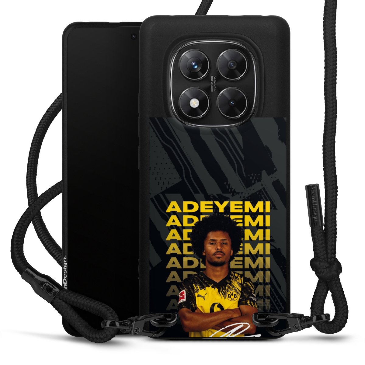 The matt black silicone case is made of flexible TPU (thermoplastic polyurethane) and offers robust protection. The durable, unbreakable material makes the cover flexible and dimensionally stable at the same time. The matte surface makes your design stand out more and is less susceptible to fingerprints and dirt. The stylish trend accessory fits comfortably in the hand and is perfectly complemented by the fabric (polyester) mobile phone strap. The braided fabric strap is approx. 1.70 metres long with a diameter of approx. 0.5 cm. Due to the special knotting technique, the length of the strap can be adjusted by simply pulling it, so that you can adapt it individually to your wishes. The practical case to wear around your neck is available with the fabric strap in black. As a little icing on the cake, we have provided the strap with a chic metal fastener in matt black. The strap is securely fastened to the case with loops made of high-quality genuine leather and press studs. The ends of the fabric strap are covered with metallic end caps and thus protected from fraying.