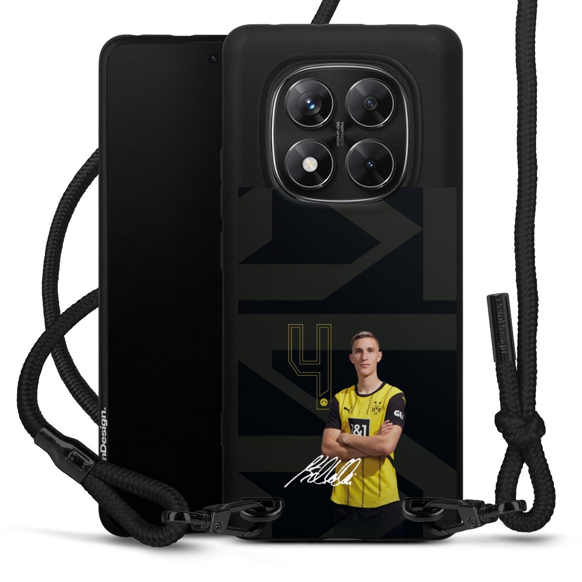 The matt black silicone case is made of flexible TPU (thermoplastic polyurethane) and offers robust protection. The durable, unbreakable material makes the cover flexible and dimensionally stable at the same time. The matte surface makes your design stand out more and is less susceptible to fingerprints and dirt. The stylish trend accessory fits comfortably in the hand and is perfectly complemented by the fabric (polyester) mobile phone strap. The braided fabric strap is approx. 1.70 metres long with a diameter of approx. 0.5 cm. Due to the special knotting technique, the length of the strap can be adjusted by simply pulling it, so that you can adapt it individually to your wishes. The practical case to wear around your neck is available with the fabric strap in black. As a little icing on the cake, we have provided the strap with a chic metal fastener in matt black. The strap is securely fastened to the case with loops made of high-quality genuine leather and press studs. The ends of the fabric strap are covered with metallic end caps and thus protected from fraying.