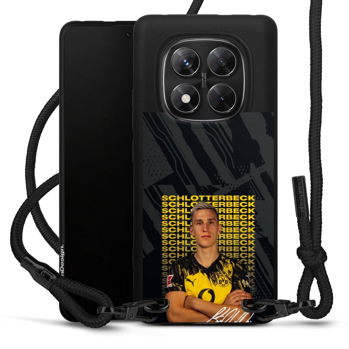 The matt black silicone case is made of flexible TPU (thermoplastic polyurethane) and offers robust protection. The durable, unbreakable material makes the cover flexible and dimensionally stable at the same time. The matte surface makes your design stand out more and is less susceptible to fingerprints and dirt. The stylish trend accessory fits comfortably in the hand and is perfectly complemented by the fabric (polyester) mobile phone strap. The braided fabric strap is approx. 1.70 metres long with a diameter of approx. 0.5 cm. Due to the special knotting technique, the length of the strap can be adjusted by simply pulling it, so that you can adapt it individually to your wishes. The practical case to wear around your neck is available with the fabric strap in black. As a little icing on the cake, we have provided the strap with a chic metal fastener in matt black. The strap is securely fastened to the case with loops made of high-quality genuine leather and press studs. The ends of the fabric strap are covered with metallic end caps and thus protected from fraying.
