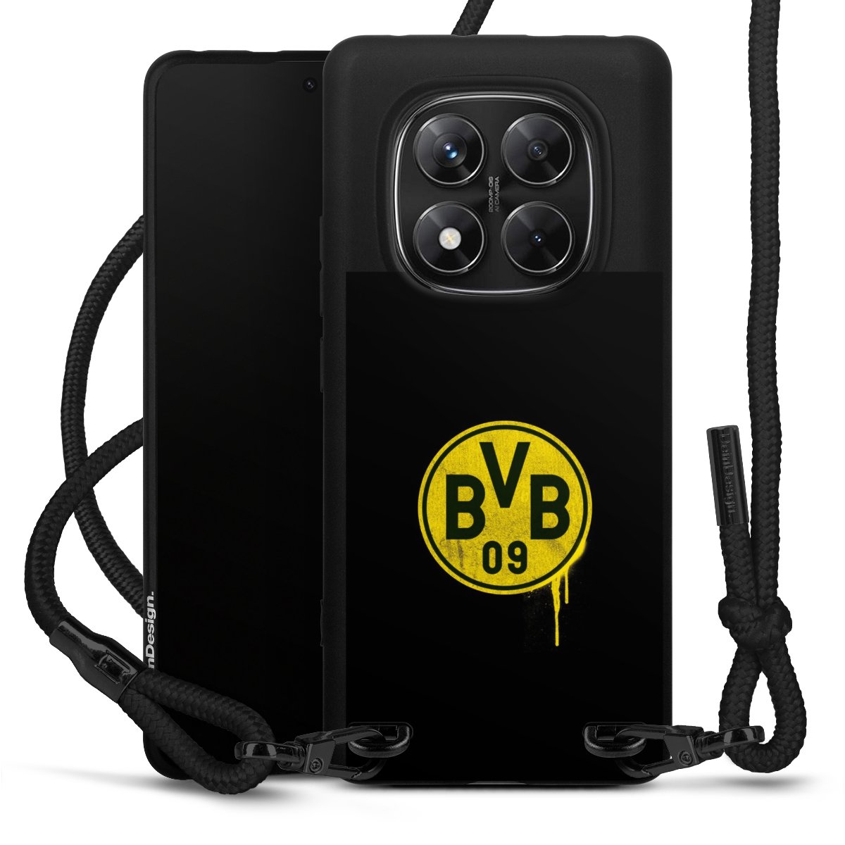 The matt black silicone case is made of flexible TPU (thermoplastic polyurethane) and offers robust protection. The durable, unbreakable material makes the cover flexible and dimensionally stable at the same time. The matte surface makes your design stand out more and is less susceptible to fingerprints and dirt. The stylish trend accessory fits comfortably in the hand and is perfectly complemented by the fabric (polyester) mobile phone strap. The braided fabric strap is approx. 1.70 metres long with a diameter of approx. 0.5 cm. Due to the special knotting technique, the length of the strap can be adjusted by simply pulling it, so that you can adapt it individually to your wishes. The practical case to wear around your neck is available with the fabric strap in black. As a little icing on the cake, we have provided the strap with a chic metal fastener in matt black. The strap is securely fastened to the case with loops made of high-quality genuine leather and press studs. The ends of the fabric strap are covered with metallic end caps and thus protected from fraying.