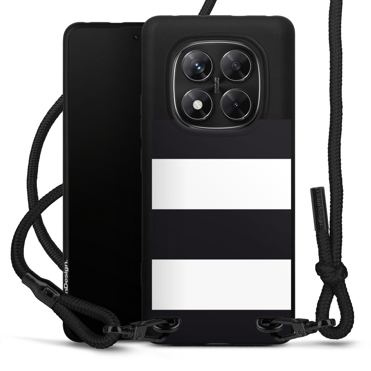 The matt black silicone case is made of flexible TPU (thermoplastic polyurethane) and offers robust protection. The durable, unbreakable material makes the cover flexible and dimensionally stable at the same time. The matte surface makes your design stand out more and is less susceptible to fingerprints and dirt. The stylish trend accessory fits comfortably in the hand and is perfectly complemented by the fabric (polyester) mobile phone strap. The braided fabric strap is approx. 1.70 metres long with a diameter of approx. 0.5 cm. Due to the special knotting technique, the length of the strap can be adjusted by simply pulling it, so that you can adapt it individually to your wishes. The practical case to wear around your neck is available with the fabric strap in black. As a little icing on the cake, we have provided the strap with a chic metal fastener in matt black. The strap is securely fastened to the case with loops made of high-quality genuine leather and press studs. The ends of the fabric strap are covered with metallic end caps and thus protected from fraying.