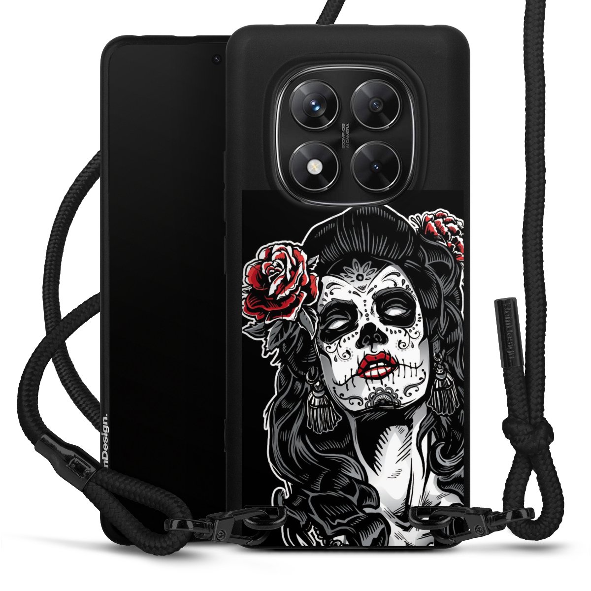 The matt black silicone case is made of flexible TPU (thermoplastic polyurethane) and offers robust protection. The durable, unbreakable material makes the cover flexible and dimensionally stable at the same time. The matte surface makes your design stand out more and is less susceptible to fingerprints and dirt. The stylish trend accessory fits comfortably in the hand and is perfectly complemented by the fabric (polyester) mobile phone strap. The braided fabric strap is approx. 1.70 metres long with a diameter of approx. 0.5 cm. Due to the special knotting technique, the length of the strap can be adjusted by simply pulling it, so that you can adapt it individually to your wishes. The practical case to wear around your neck is available with the fabric strap in black. As a little icing on the cake, we have provided the strap with a chic metal fastener in matt black. The strap is securely fastened to the case with loops made of high-quality genuine leather and press studs. The ends of the fabric strap are covered with metallic end caps and thus protected from fraying.