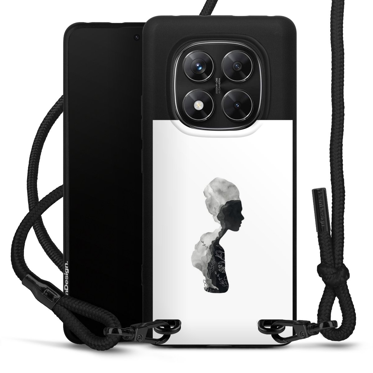 The matt black silicone case is made of flexible TPU (thermoplastic polyurethane) and offers robust protection. The durable, unbreakable material makes the cover flexible and dimensionally stable at the same time. The matte surface makes your design stand out more and is less susceptible to fingerprints and dirt. The stylish trend accessory fits comfortably in the hand and is perfectly complemented by the fabric (polyester) mobile phone strap. The braided fabric strap is approx. 1.70 metres long with a diameter of approx. 0.5 cm. Due to the special knotting technique, the length of the strap can be adjusted by simply pulling it, so that you can adapt it individually to your wishes. The practical case to wear around your neck is available with the fabric strap in black. As a little icing on the cake, we have provided the strap with a chic metal fastener in matt black. The strap is securely fastened to the case with loops made of high-quality genuine leather and press studs. The ends of the fabric strap are covered with metallic end caps and thus protected from fraying.