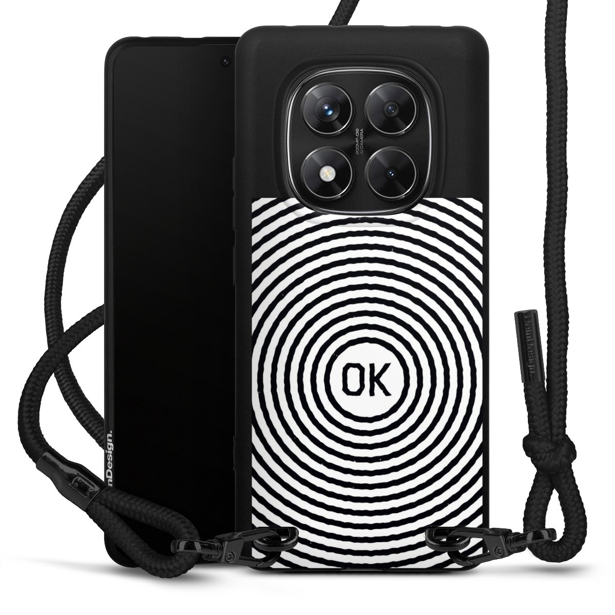 The matt black silicone case is made of flexible TPU (thermoplastic polyurethane) and offers robust protection. The durable, unbreakable material makes the cover flexible and dimensionally stable at the same time. The matte surface makes your design stand out more and is less susceptible to fingerprints and dirt. The stylish trend accessory fits comfortably in the hand and is perfectly complemented by the fabric (polyester) mobile phone strap. The braided fabric strap is approx. 1.70 metres long with a diameter of approx. 0.5 cm. Due to the special knotting technique, the length of the strap can be adjusted by simply pulling it, so that you can adapt it individually to your wishes. The practical case to wear around your neck is available with the fabric strap in black. As a little icing on the cake, we have provided the strap with a chic metal fastener in matt black. The strap is securely fastened to the case with loops made of high-quality genuine leather and press studs. The ends of the fabric strap are covered with metallic end caps and thus protected from fraying.