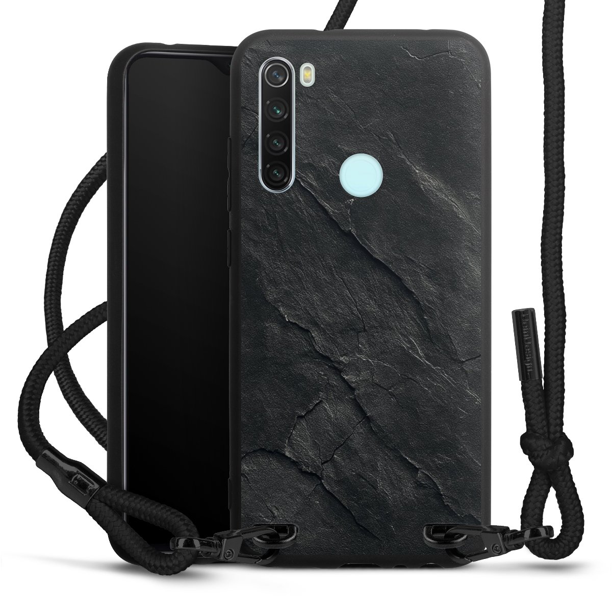 The matt black silicone case is made of flexible TPU (thermoplastic polyurethane) and offers robust protection. The durable, unbreakable material makes the cover flexible and dimensionally stable at the same time. The matte surface makes your design stand out more and is less susceptible to fingerprints and dirt. The stylish trend accessory fits comfortably in the hand and is perfectly complemented by the fabric (polyester) mobile phone strap. The braided fabric strap is approx. 1.70 metres long with a diameter of approx. 0.5 cm. Due to the special knotting technique, the length of the strap can be adjusted by simply pulling it, so that you can adapt it individually to your wishes. The practical case to wear around your neck is available with the fabric strap in black. As a little icing on the cake, we have provided the strap with a chic metal fastener in matt black. The strap is securely fastened to the case with loops made of high-quality genuine leather and press studs. The ends of the fabric strap are covered with metallic end caps and thus protected from fraying.