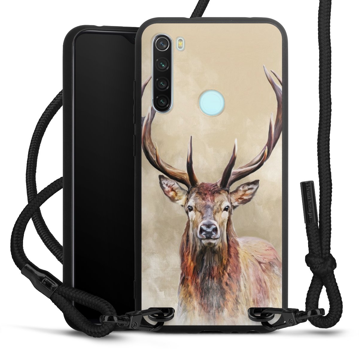 The matt black silicone case is made of flexible TPU (thermoplastic polyurethane) and offers robust protection. The durable, unbreakable material makes the cover flexible and dimensionally stable at the same time. The matte surface makes your design stand out more and is less susceptible to fingerprints and dirt. The stylish trend accessory fits comfortably in the hand and is perfectly complemented by the fabric (polyester) mobile phone strap. The braided fabric strap is approx. 1.70 metres long with a diameter of approx. 0.5 cm. Due to the special knotting technique, the length of the strap can be adjusted by simply pulling it, so that you can adapt it individually to your wishes. The practical case to wear around your neck is available with the fabric strap in black. As a little icing on the cake, we have provided the strap with a chic metal fastener in matt black. The strap is securely fastened to the case with loops made of high-quality genuine leather and press studs. The ends of the fabric strap are covered with metallic end caps and thus protected from fraying.