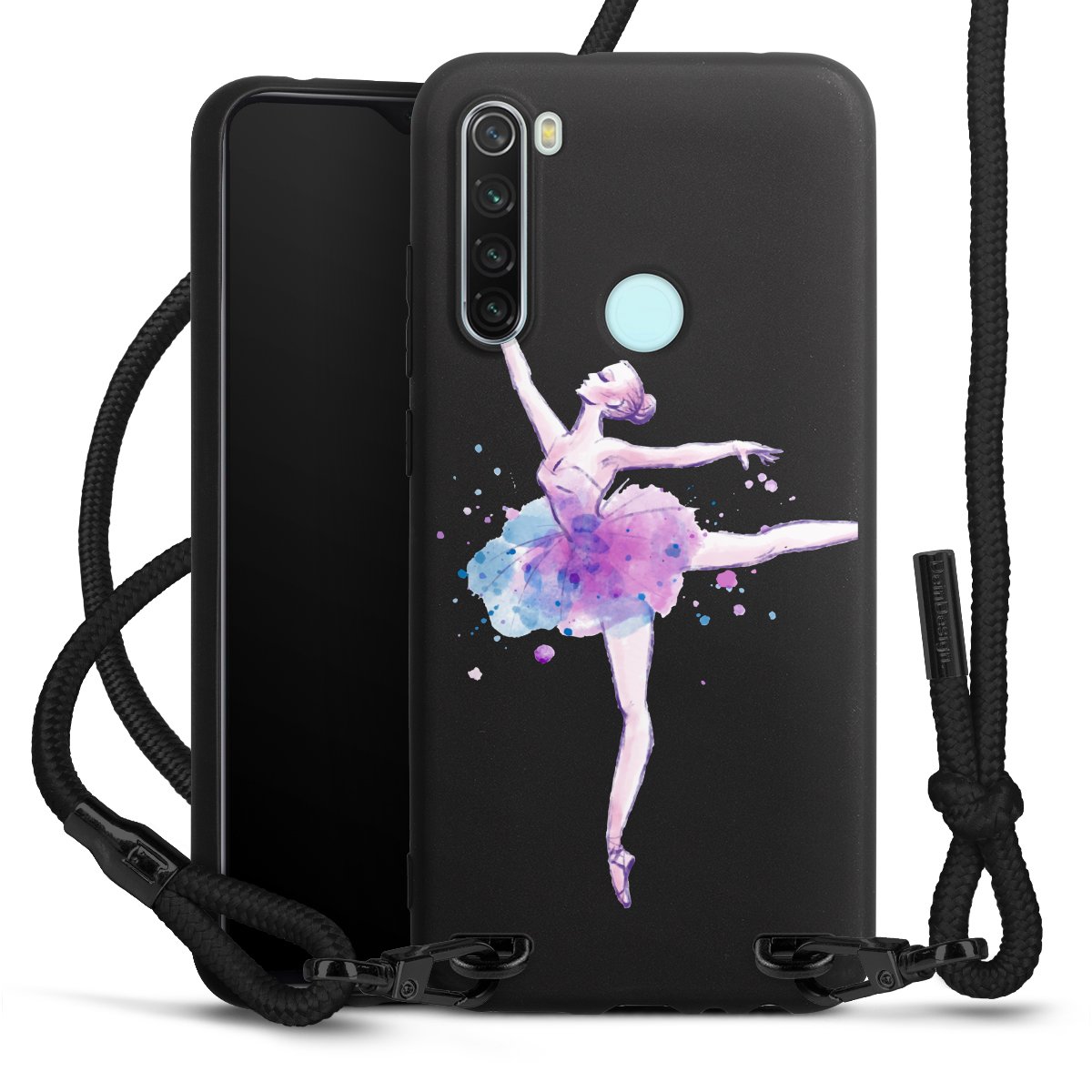 The matt black silicone case is made of flexible TPU (thermoplastic polyurethane) and offers robust protection. The durable, unbreakable material makes the cover flexible and dimensionally stable at the same time. The matte surface makes your design stand out more and is less susceptible to fingerprints and dirt. The stylish trend accessory fits comfortably in the hand and is perfectly complemented by the fabric (polyester) mobile phone strap. The braided fabric strap is approx. 1.70 metres long with a diameter of approx. 0.5 cm. Due to the special knotting technique, the length of the strap can be adjusted by simply pulling it, so that you can adapt it individually to your wishes. The practical case to wear around your neck is available with the fabric strap in black. As a little icing on the cake, we have provided the strap with a chic metal fastener in matt black. The strap is securely fastened to the case with loops made of high-quality genuine leather and press studs. The ends of the fabric strap are covered with metallic end caps and thus protected from fraying.